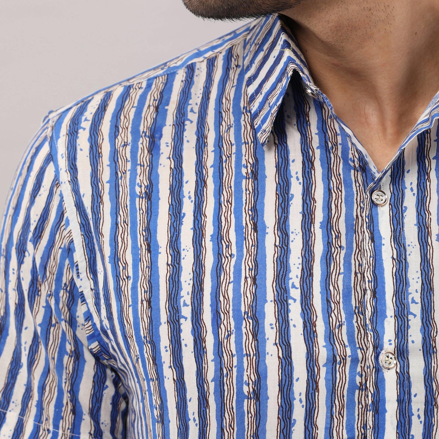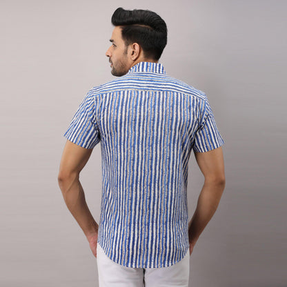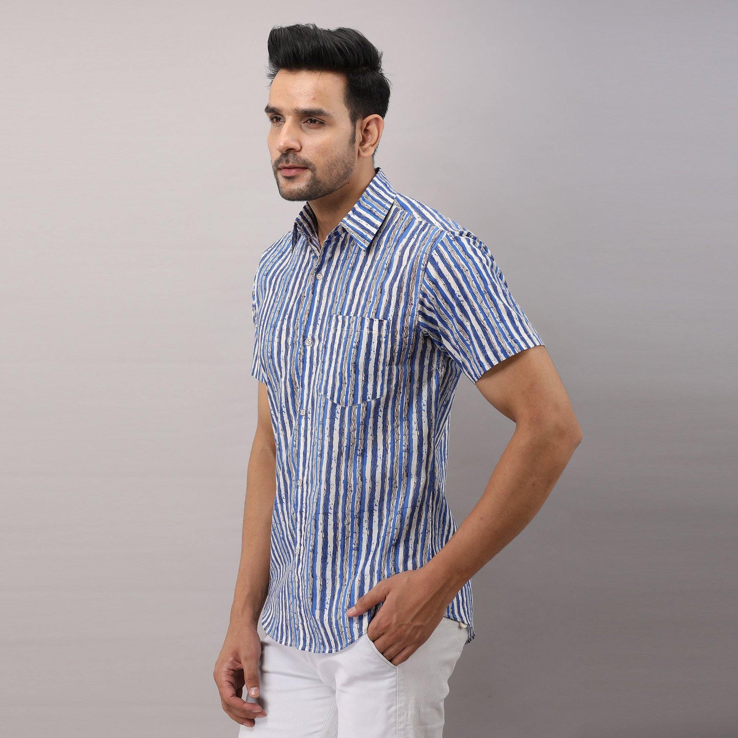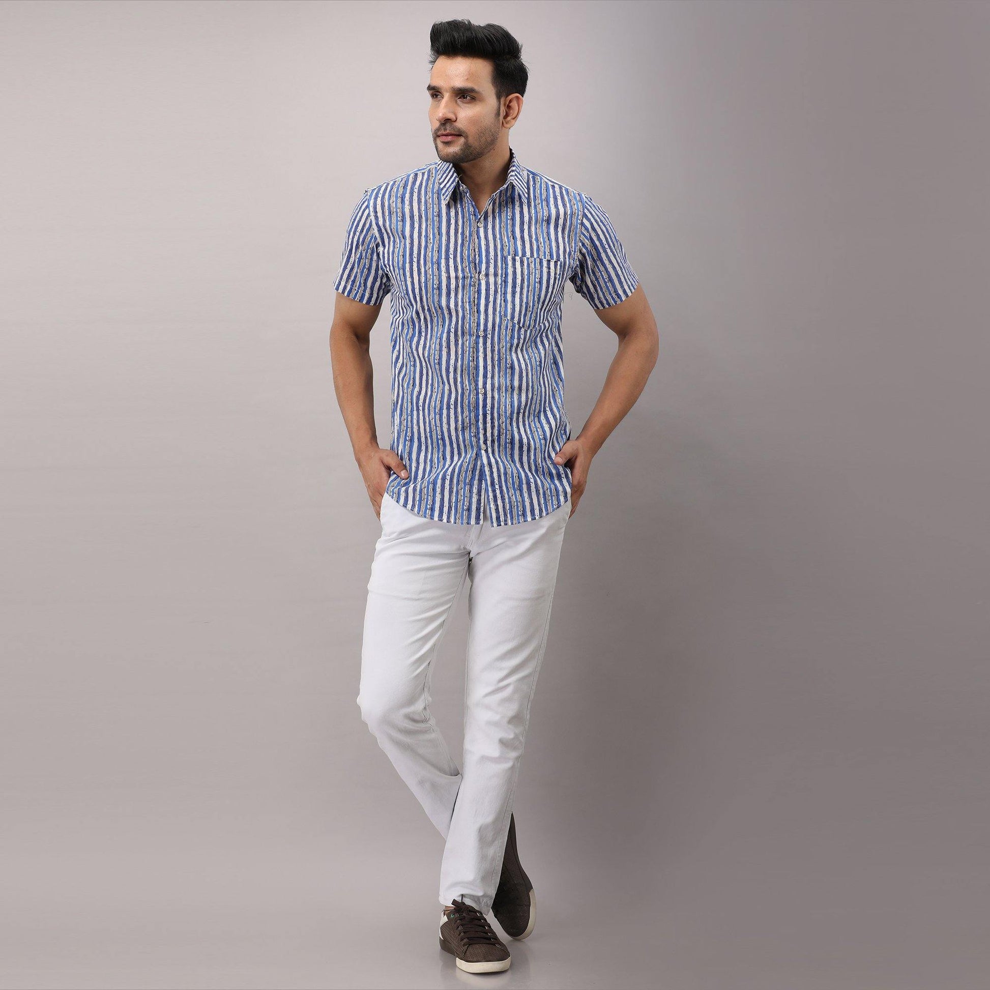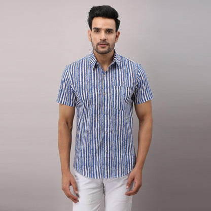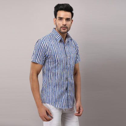 This comfortable half-sleeved block printed shirt is any wearer's favorite. Crafted in breathable pure cotton, prints are made from vegetable dye, it is fashioned to create a sophisticated impression with its smart regular collar and hand block printed design.