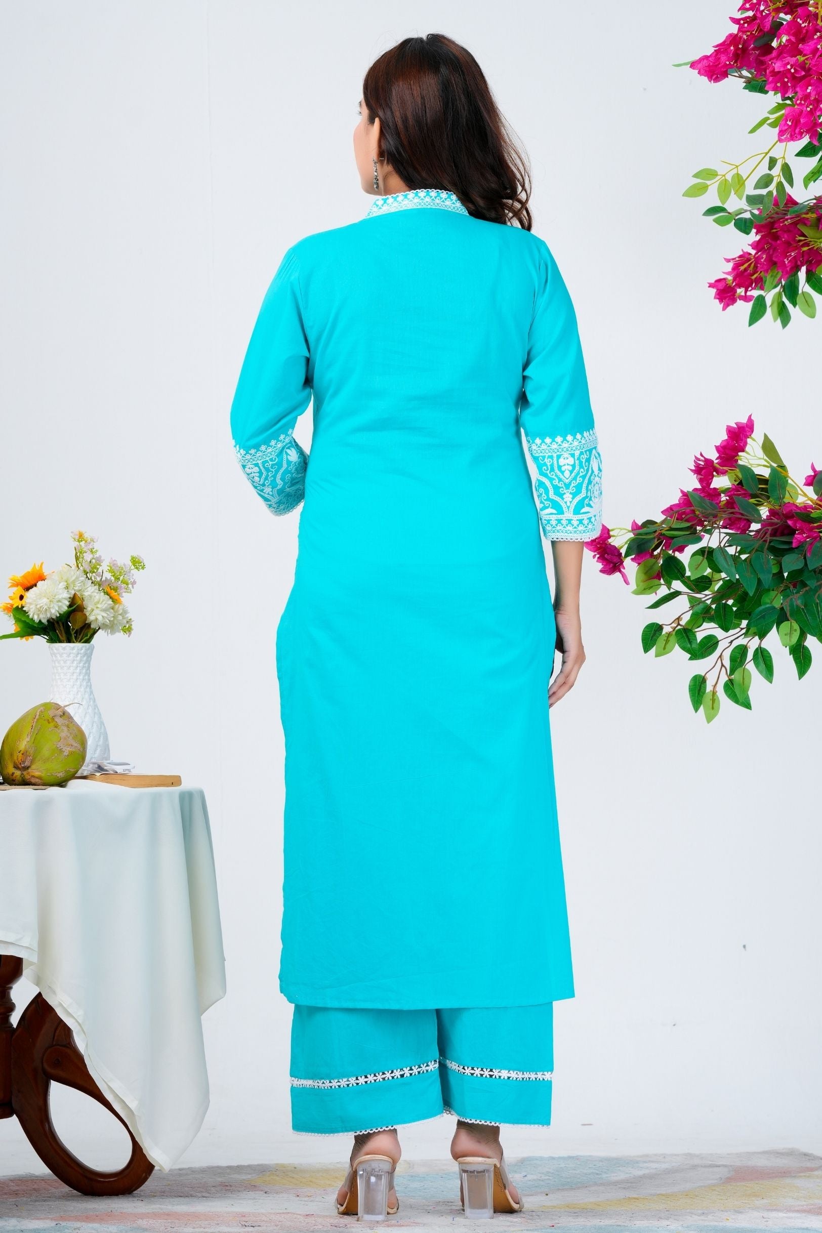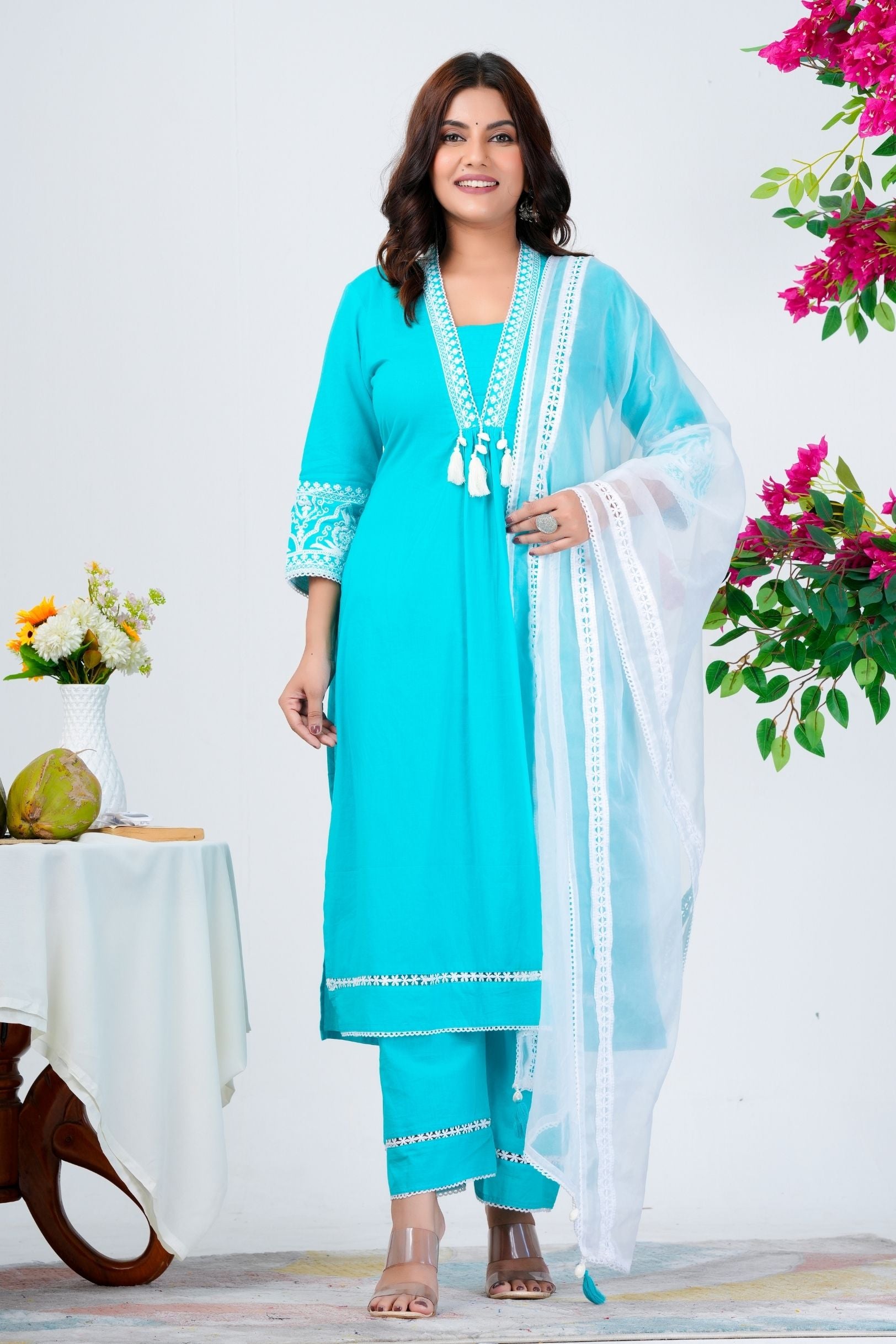 Step into timeless elegance with this aqua blue kurta set designed to bring comfort and style together. The soft fabric, delicate embroidery, and sheer white dupatta make it a perfect choice for festive gatherings, casual outings, or family celebrations.