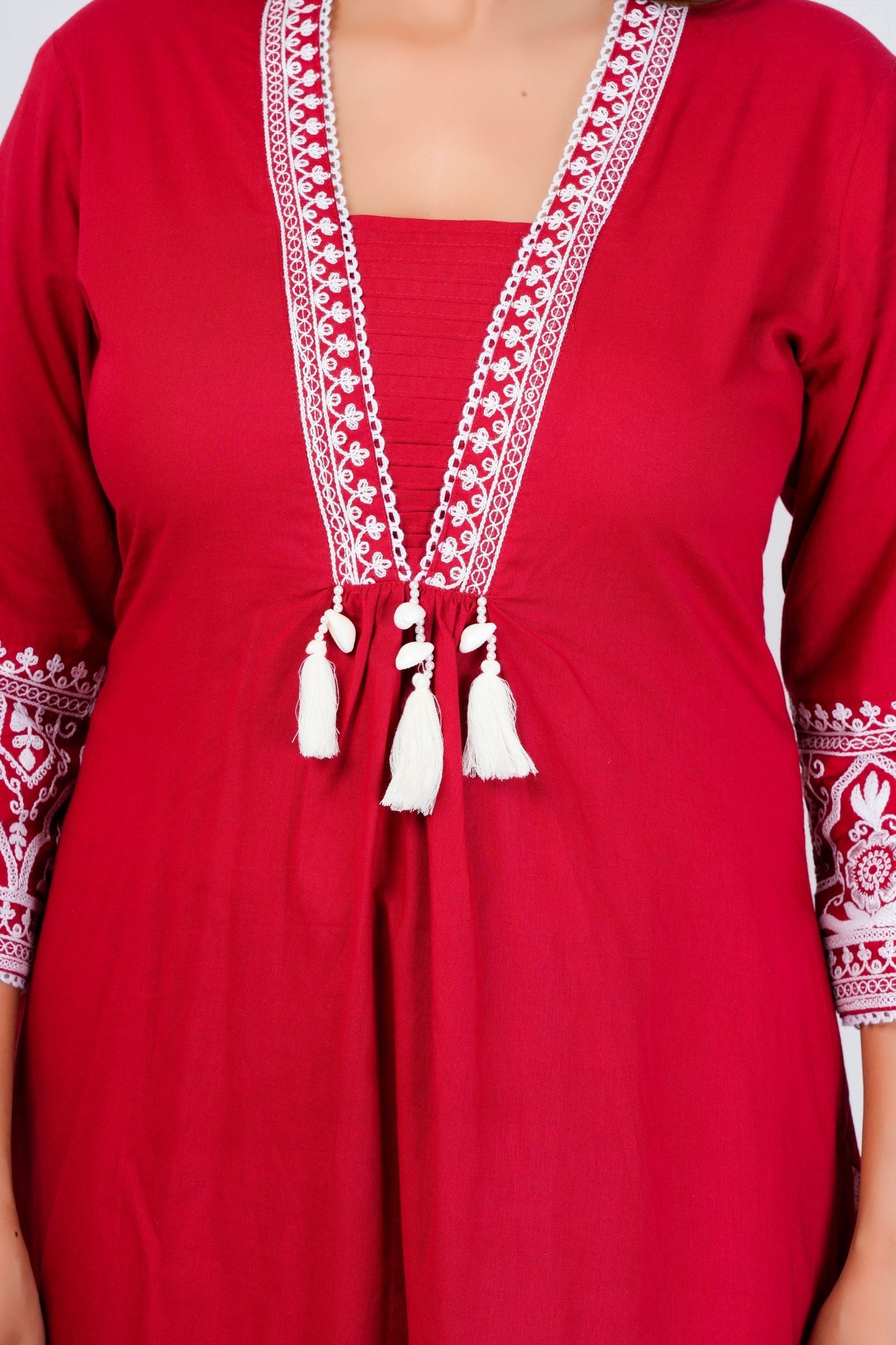 Make a statement with this stunning red kurta set, beautifully detailed with white embroidery and tassel accents. Paired with matching pants and a sheer white dupatta, this ensemble is the perfect blend of simplicity and grace—ideal for festive occasions, parties, and everyday elegance.
