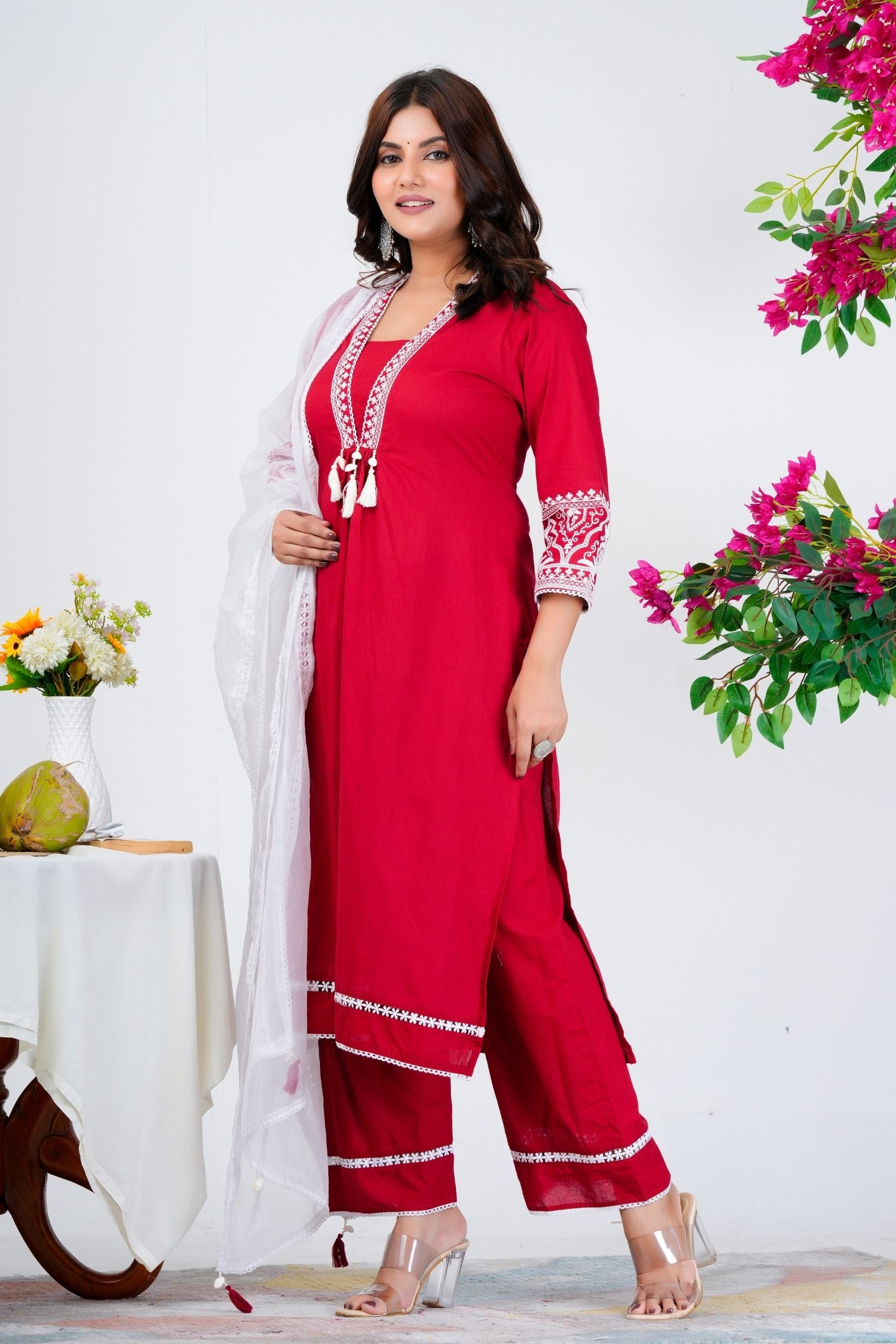 Elegant Red Embroidered Kurta Set with White Dupatta