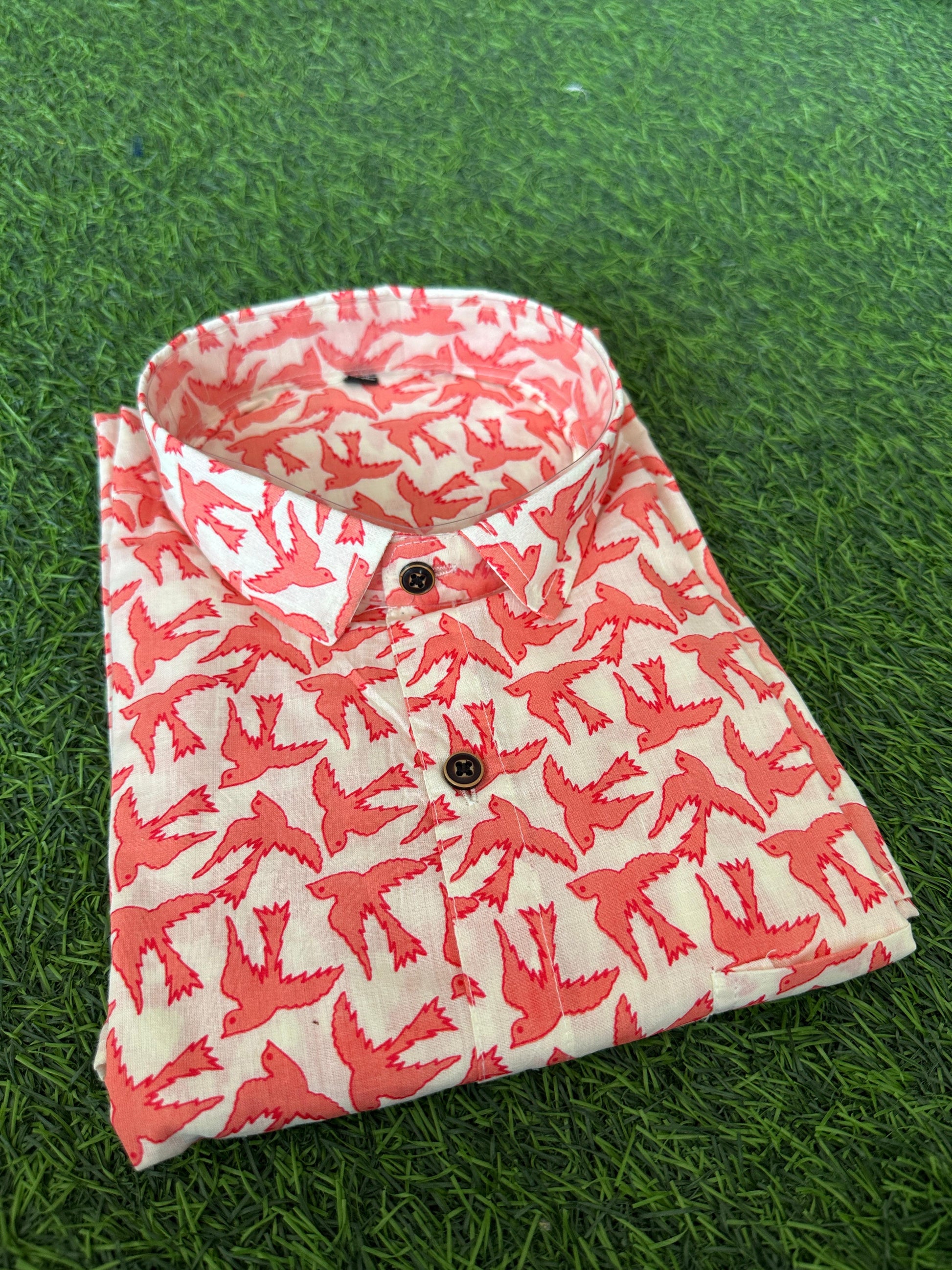 Soar into style with our Free Spirit Bird Print Half Sleeve Shirt. This vibrant shirt features an eye-catching all-over pattern of coral-hued birds against a light background, symbolizing freedom and joy. Perfect for the warm weather of Jaipur, its breathable fabric ensures you stay comfortable while making a bold fashion statement. Ideal for casual outings, relaxed gatherings, or adding a pop of color to your everyday look.