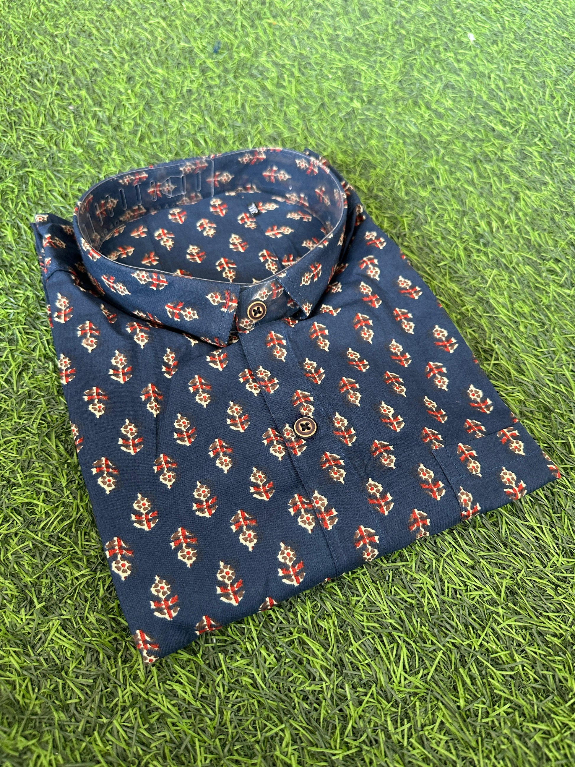 Dive into classic style with our Indigo Folk Print Half Sleeve Shirt. Featuring intricate small motifs in red and cream against a deep indigo blue background, this shirt offers a sophisticated yet artistic look. Perfect for adding a touch of cultural charm to your casual or semi-casual wardrobe, its comfortable fabric makes it ideal for the warm climate of Jaipur.