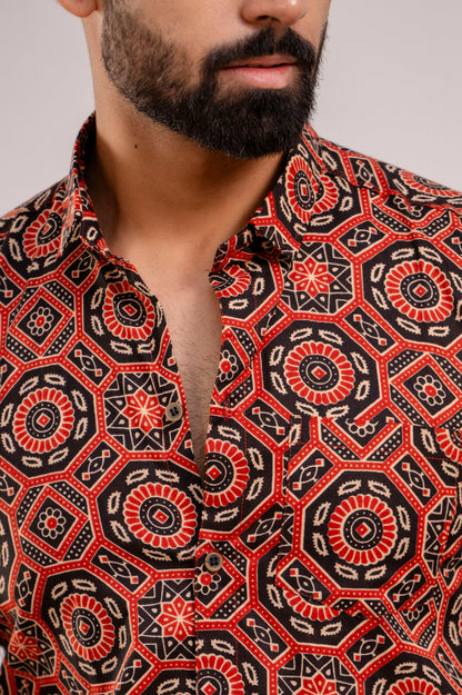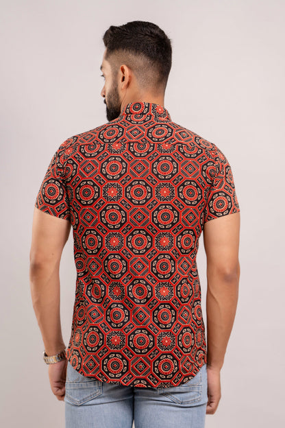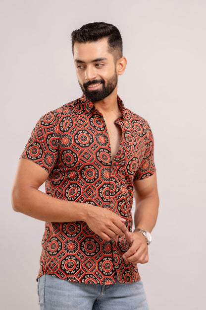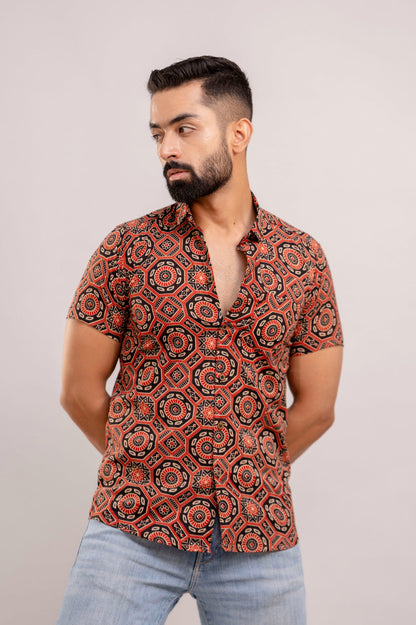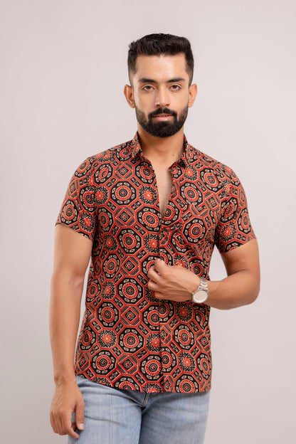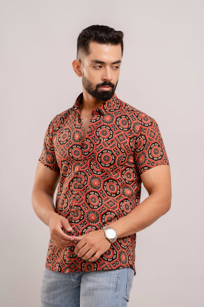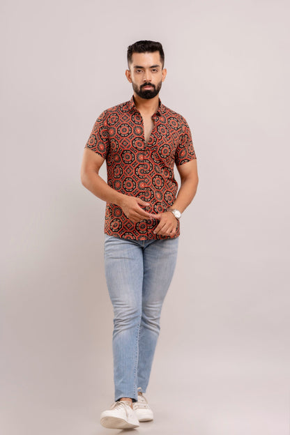 This comfortable half-sleeved block printed shirt is any wearer's favorite. Crafted in breathable pure cotton, prints are made from vegetable dye, it is fashioned to create a sophisticated impression with its smart regular collar and hand block printed design.