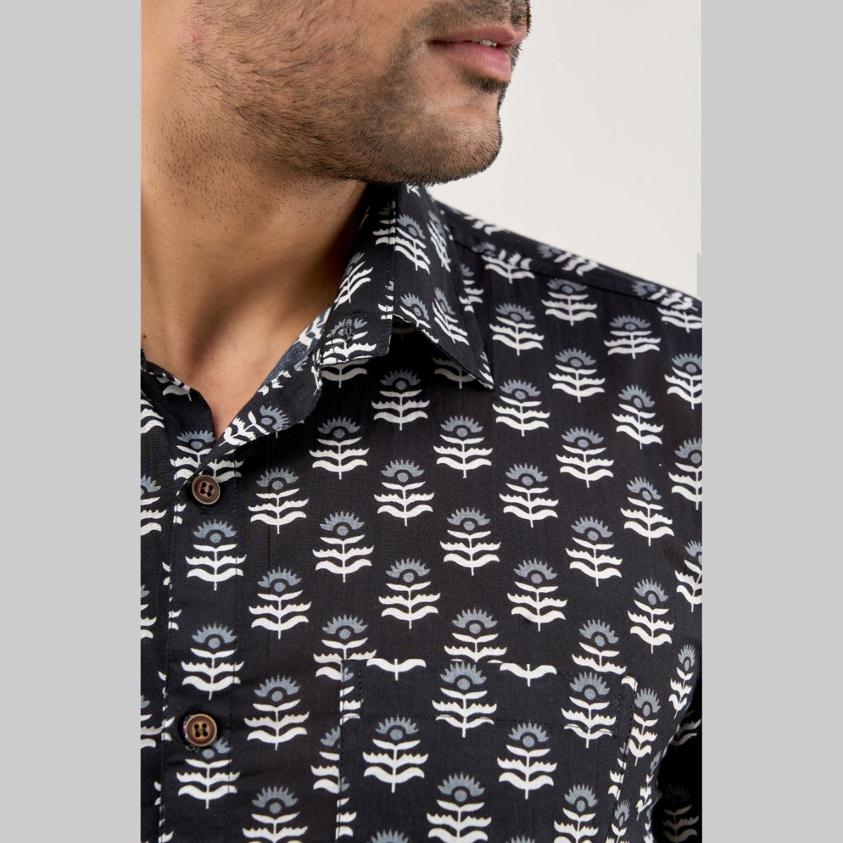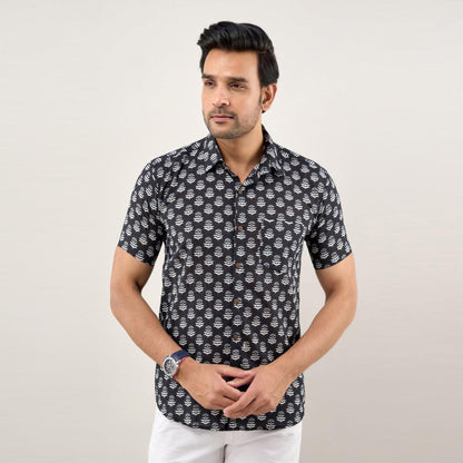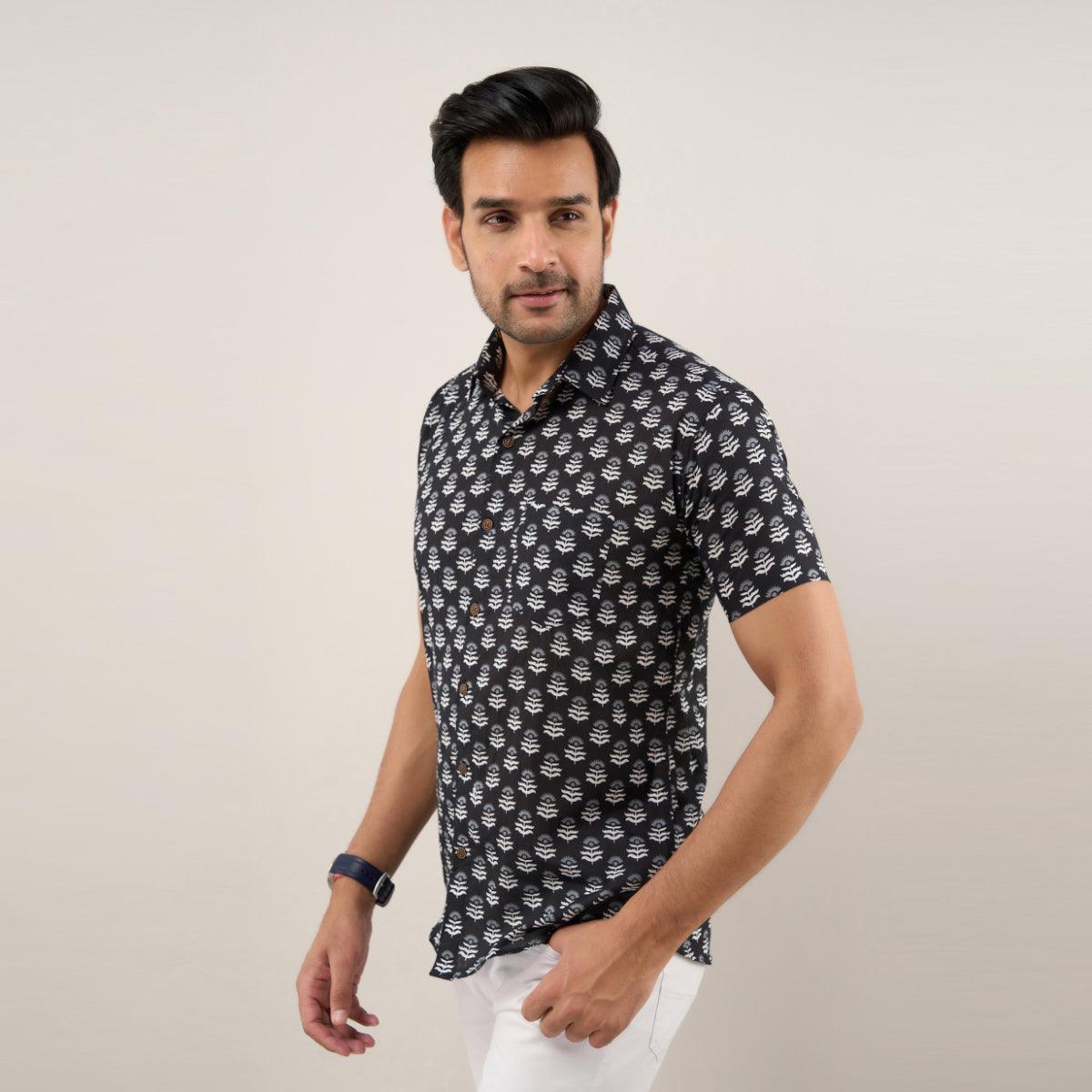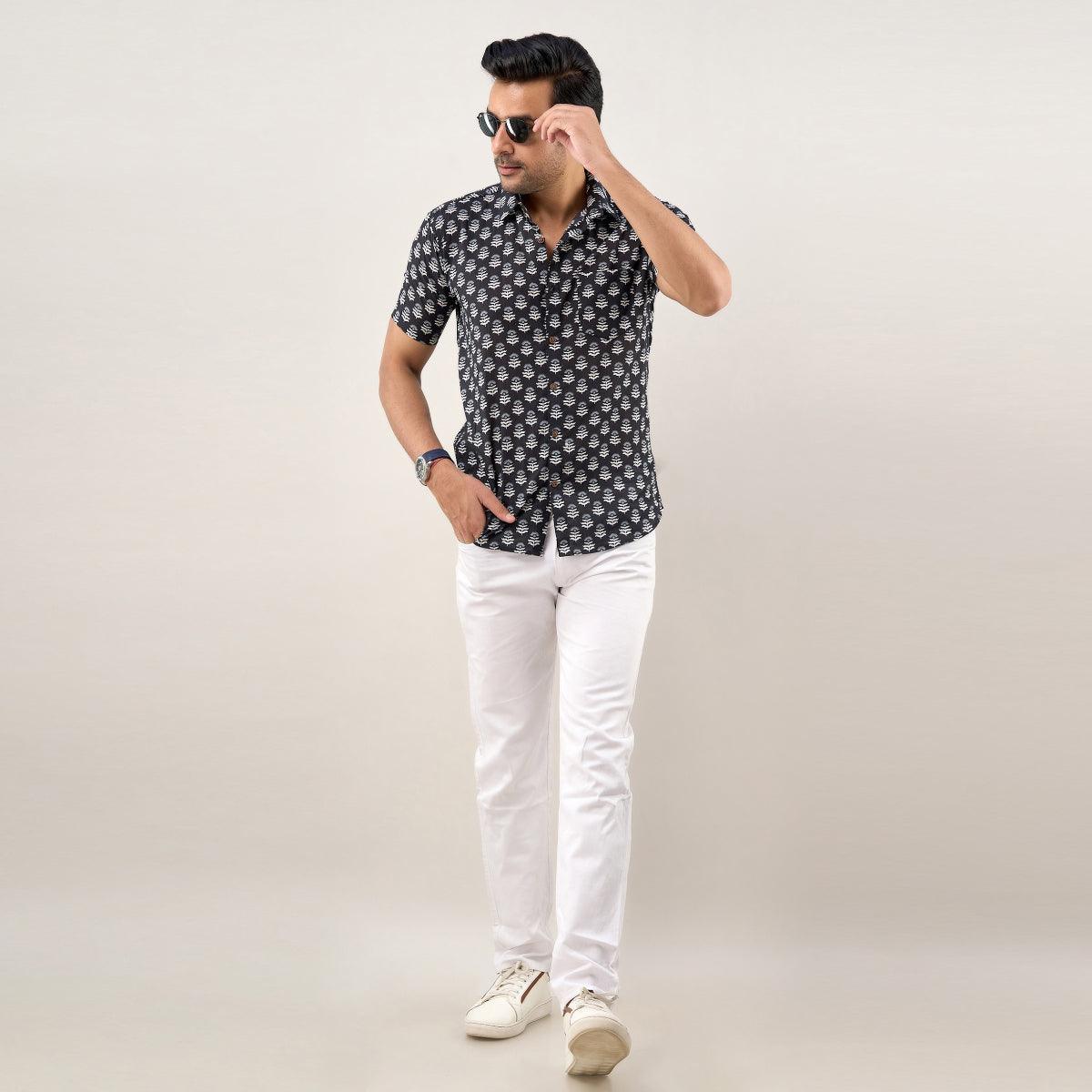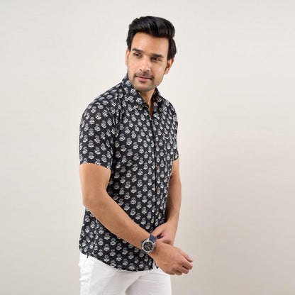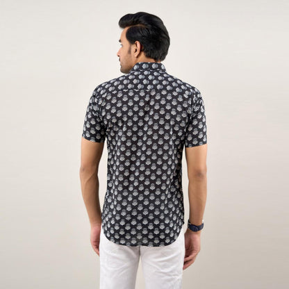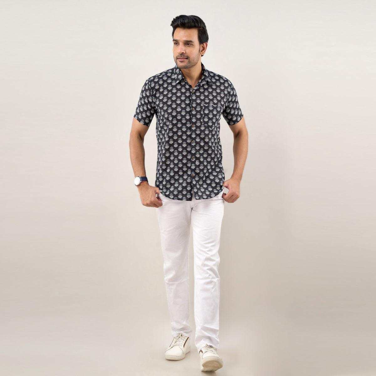 This comfortable & stylish half-sleeved block printed shirt is any wearer's favorite. Crafted in breathable pure cotton, prints are made from vegetable dye, it is fashioned to create a sophisticated impression with its smart spread collar and hand block printed design.