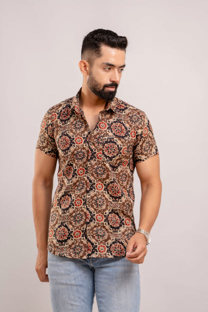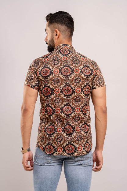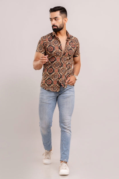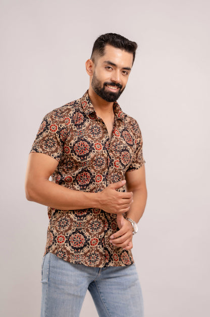 This comfortable half-sleeved block printed shirt is any wearer's favorite. Crafted in breathable pure cotton, prints are made from vegetable dye, it is fashioned to create a sophisticated impression with its smart regular collar and hand block printed design.