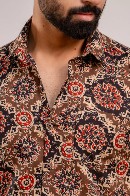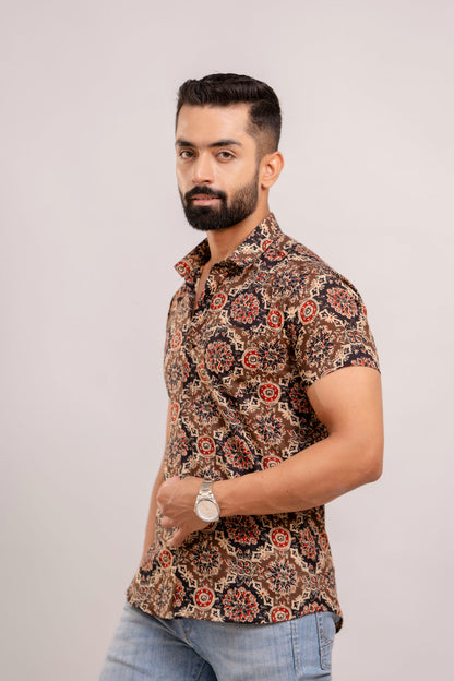 Men Brown Ethnic Printed Short Sleeves Casual Cotton Shirt