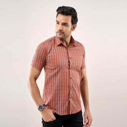 This comfortable & stylish half-sleeved block printed shirt is any wearer's favorite. Crafted in breathable pure cotton, prints are made from vegetable dye, it is fashioned to create a sophisticated impression with its smart spread collar and hand block printed design.