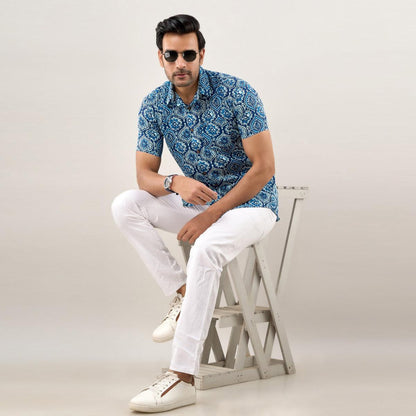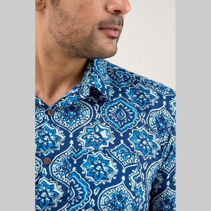 Men Indigo Blue Regular Fit Cotton Printed Casual Shirt (SHKN1035)