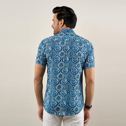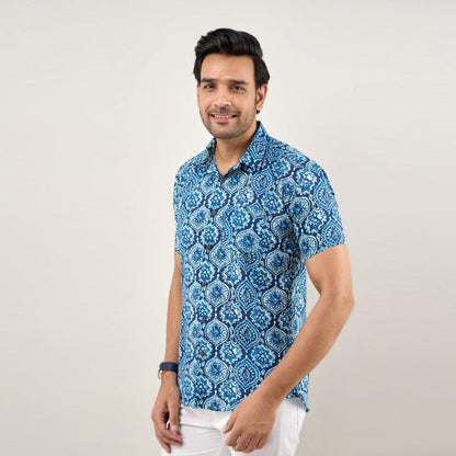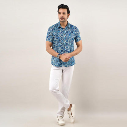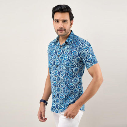 This comfortable & stylish half-sleeved block printed shirt is any wearer's favorite. Crafted in breathable pure cotton, prints are made from vegetable dye, it is fashioned to create a sophisticated impression with its smart spread collar and hand block printed design.