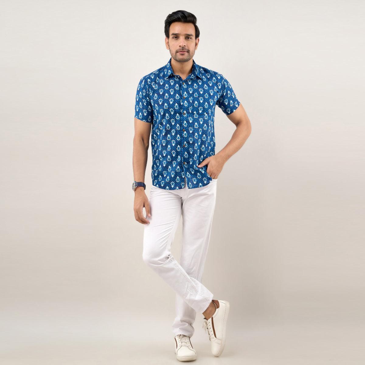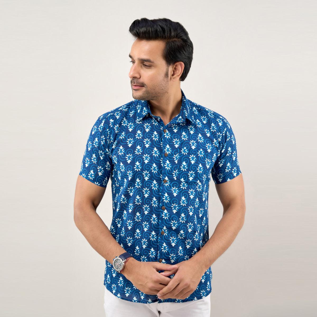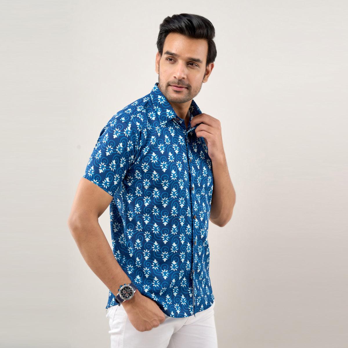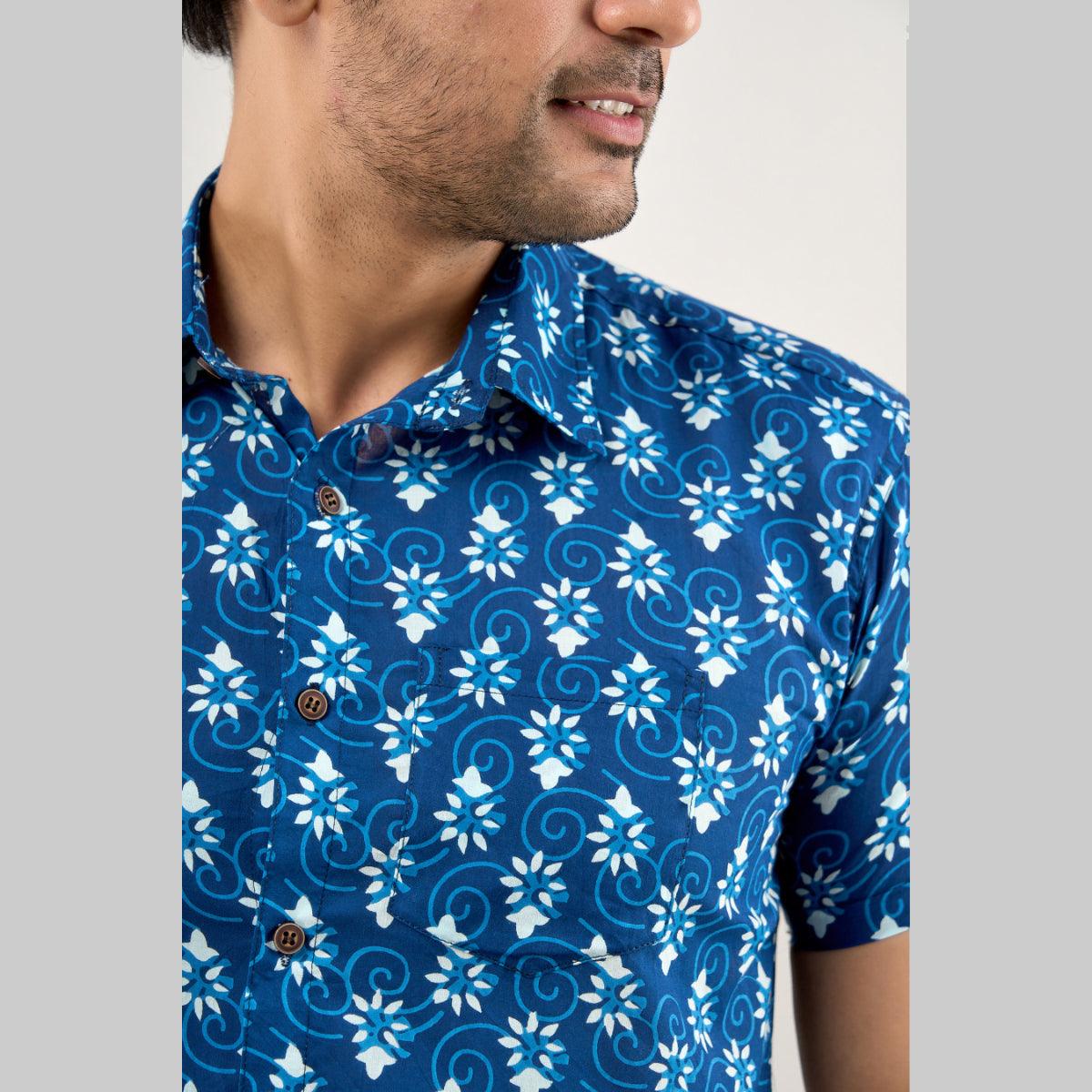 This comfortable & stylish half-sleeved block printed shirt is any wearer's favorite. Crafted in breathable pure cotton, prints are made from vegetable dye, it is fashioned to create a sophisticated impression with its smart spread collar and hand block printed design.