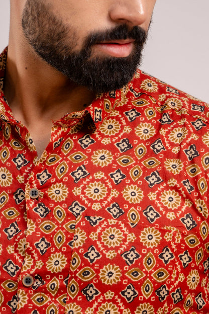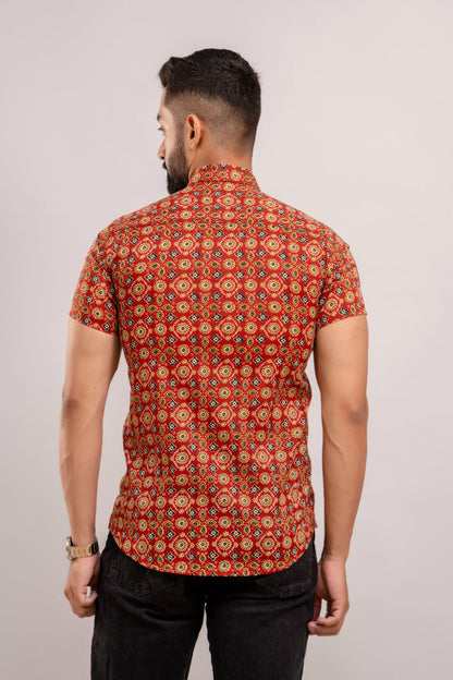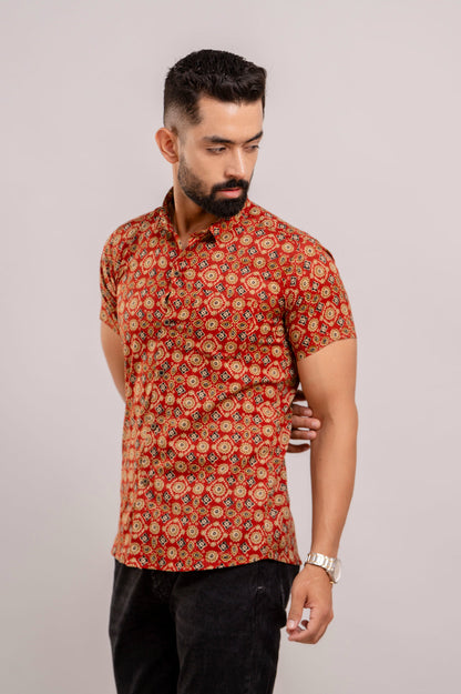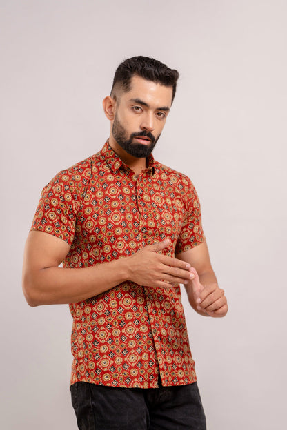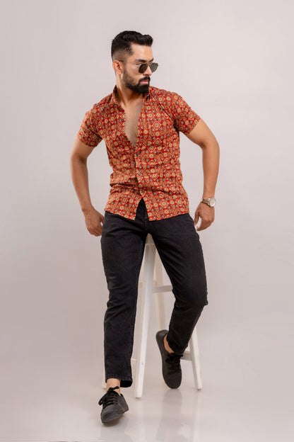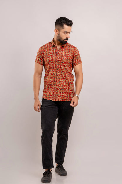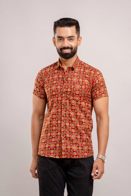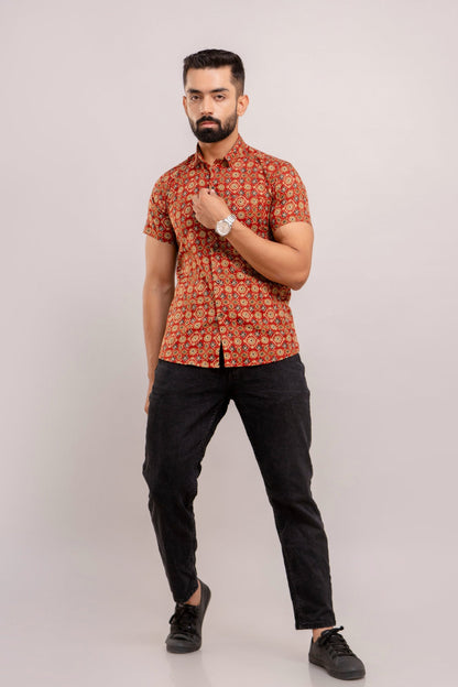 This comfortable half-sleeved block printed shirt is any wearer's favorite. Crafted in breathable pure cotton, prints are made from vegetable dye, it is fashioned to create a sophisticated impression with its smart regular collar and hand block printed design.