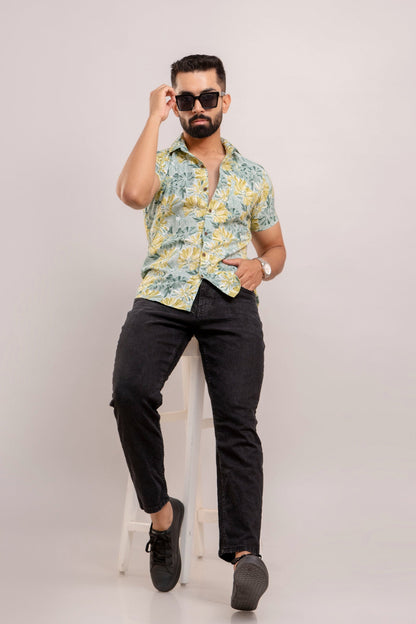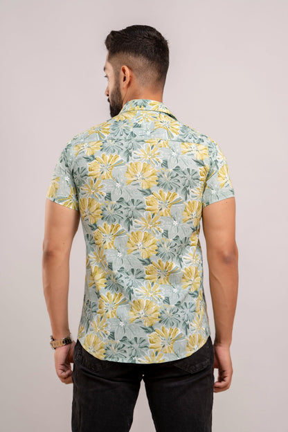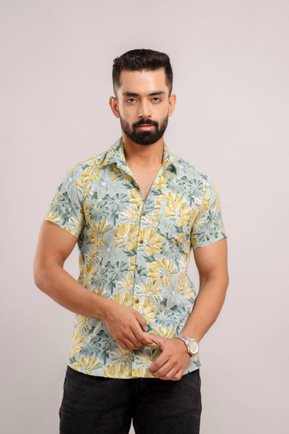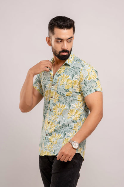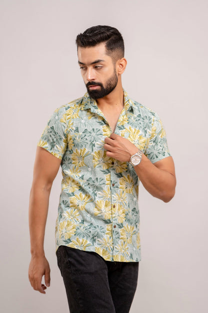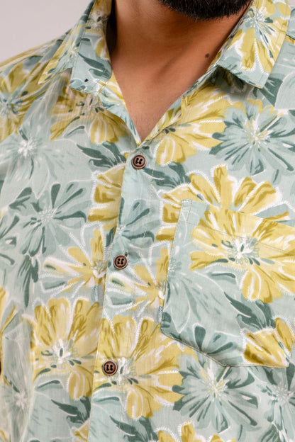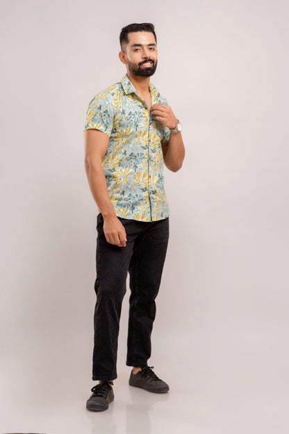 Men Sea Green Floral Printed Short Sleeves Casual Cotton Shirt