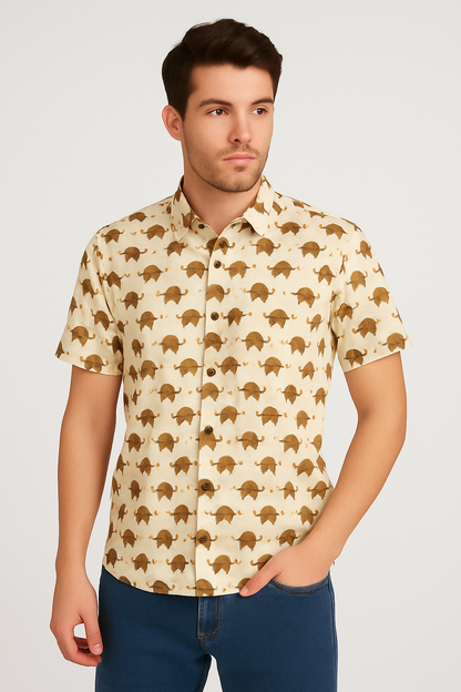 Step up your casual style with this trendy beige half sleeve shirt for men, adorned with a playful brown elephant print. Made from breathable cotton fabric, it offers all-day comfort with a dash of quirky charm. Ideal for casual outings, vacations, or relaxed office days, this shirt combines unique design with effortless wearability.