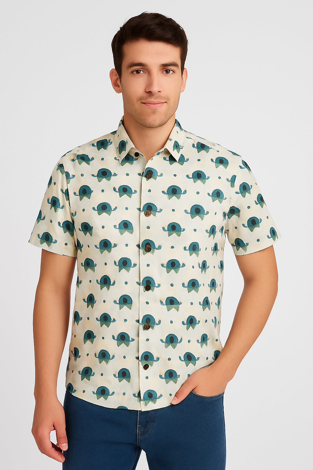 Add a playful touch to your summer wardrobe with this stylish half sleeve shirt for men, featuring a charming elephant print. Crafted from soft, breathable cotton fabric, this shirt ensures maximum comfort and a relaxed fit, making it ideal for casual outings, vacations, or everyday wear. The classic collar and button-down front enhance its smart-casual appeal.