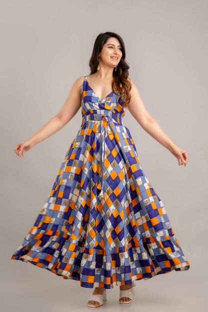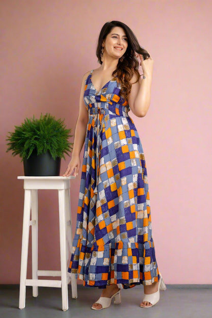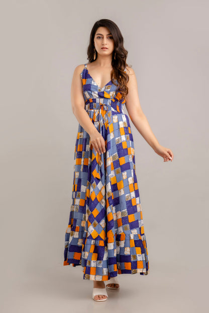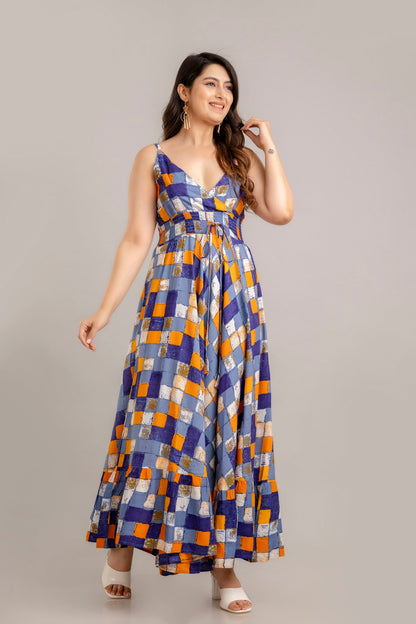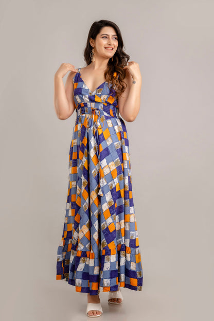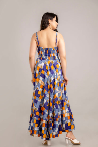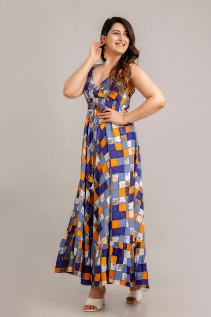 Multi Geometric Printed Sleeveless Fit and Flare Maxi Dress - SHKUP1360