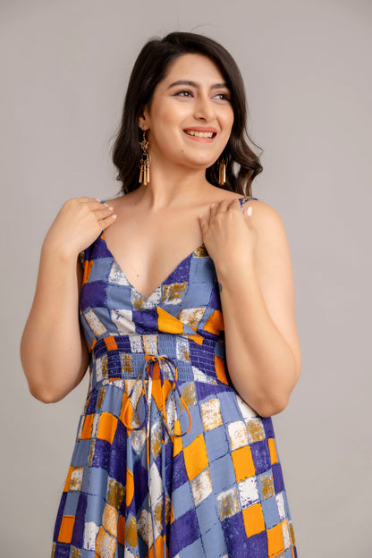 Set the tone for this season with this one-of-a-kind fit & flare dress. Show up to your work event in style by pairing this piece with caged heels and a cute blazer. A perfect dress with smocked design, sleeveless and V neck. When you need an outfit for work and dinner after work, wear this stylish piece with platform heels and some minimalistic silver jewellery..