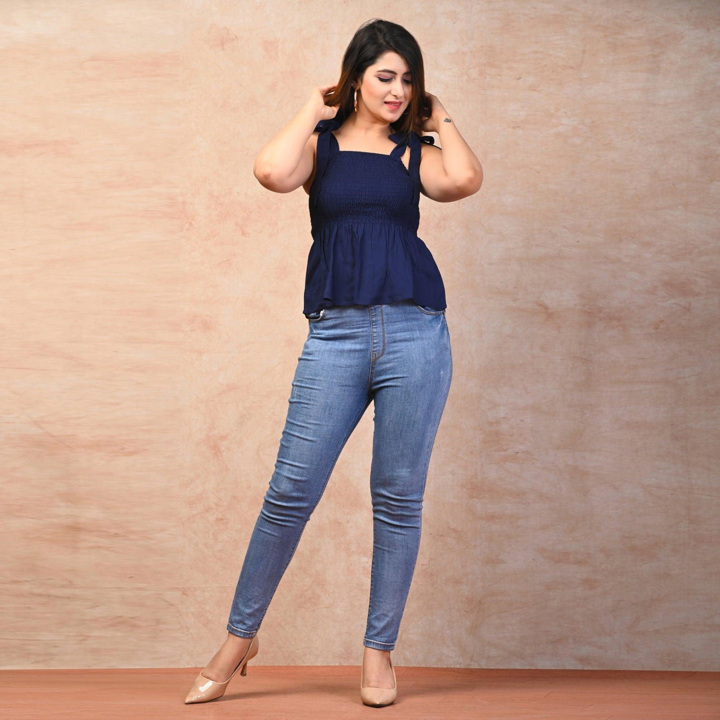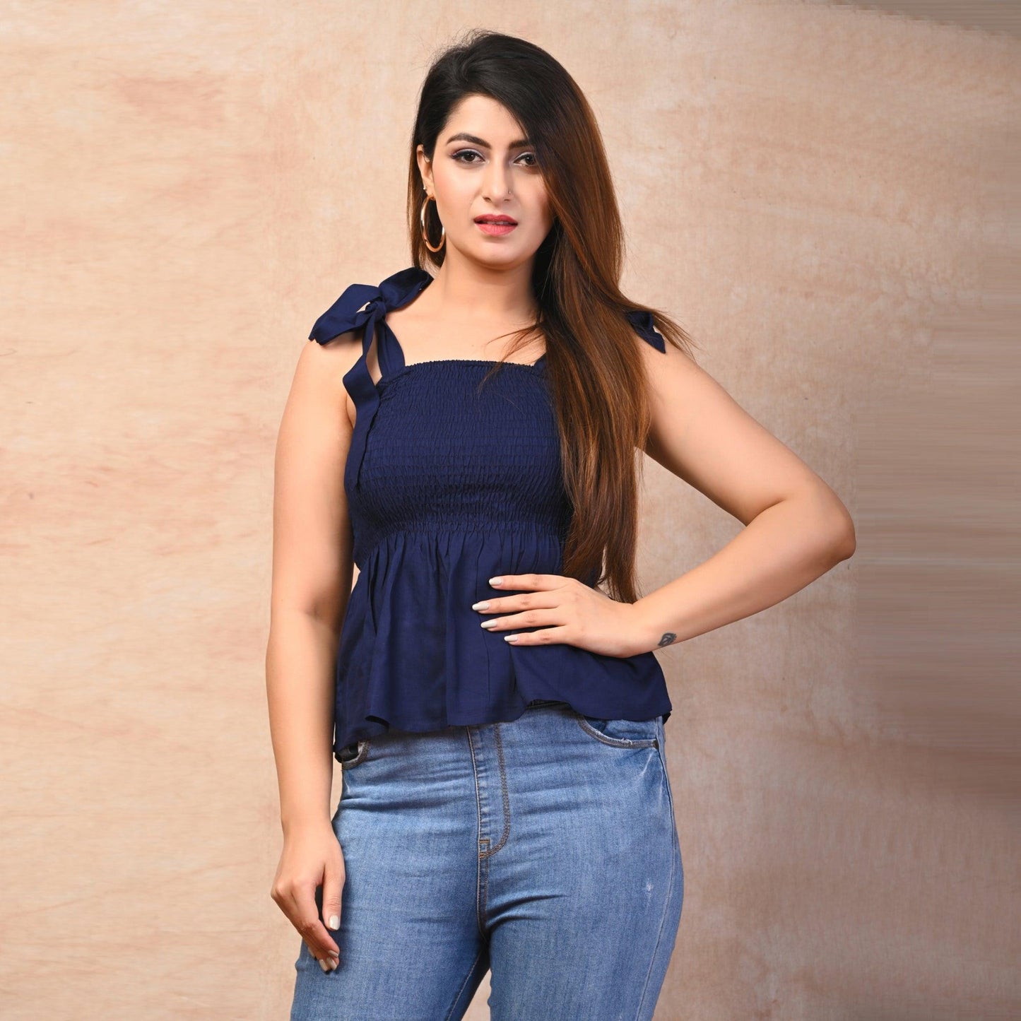 This navy blue solid smocked detailing top is a must-have style for the summer season. Tailored with a square neck, it features sleeveless, and tie-ups lace at shoulder.