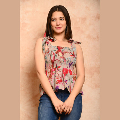 This peach and multicolored floral print smocked peplum crop top is a must-have style for the summer season. Tailored with a square neck, it features sleeveless, and tie-ups lace at shoulder.