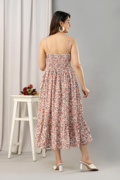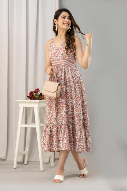 Set the tone for this season with this one-of-a-kind fit & flare dress. Show up to your work event in style by pairing this piece with caged heels and a cute blazer. A perfect dress with smocked design, sleeveless and V neck. When you need an outfit for work and dinner after work, wear this stylish piece with platform heels and some minimalistic silver Jewellery.