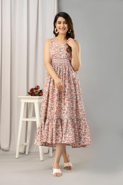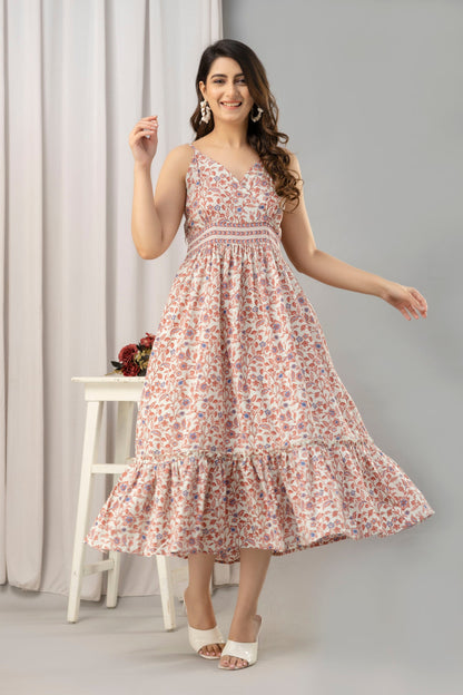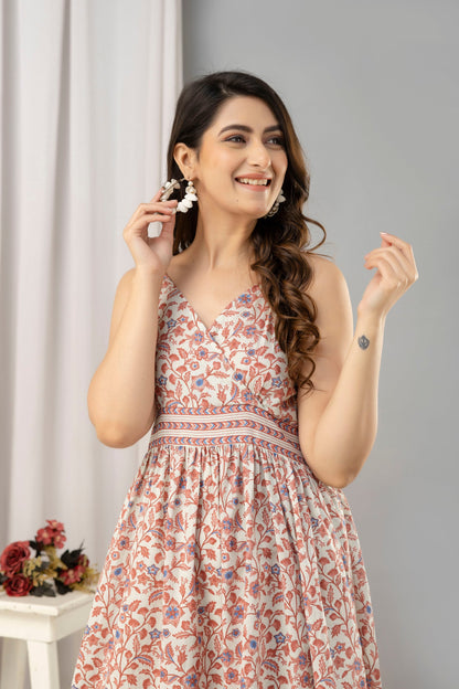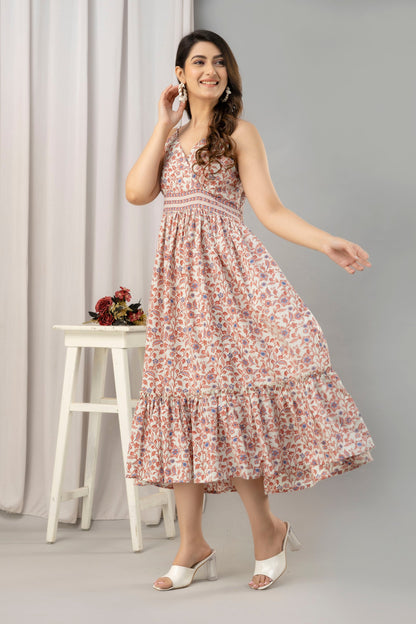 Peach Floral Printed Sleeveless Fit and Flare Maxi Dress - SHKUP1448