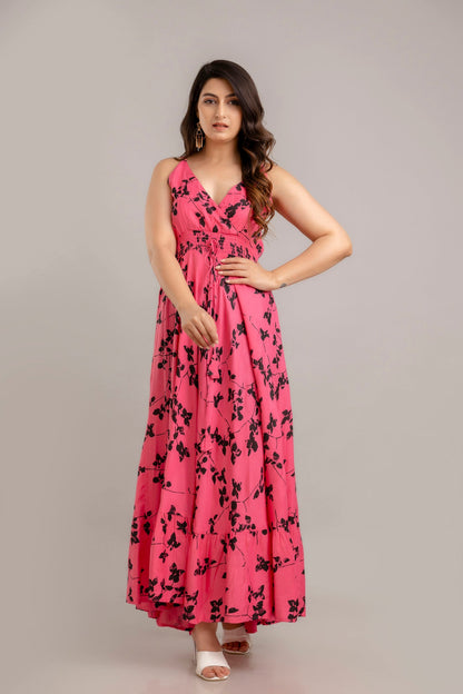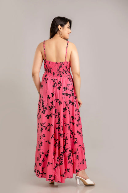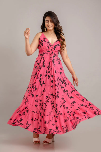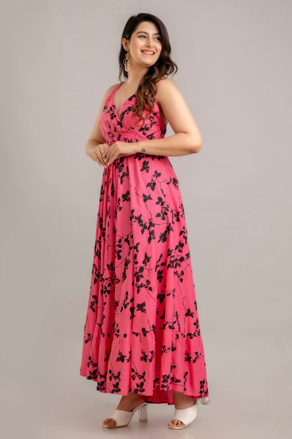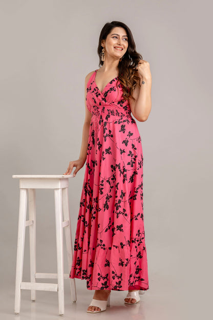 Pink Floral Printed Sleeveless Fit and Flare Maxi Dress - SHKUP1365