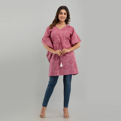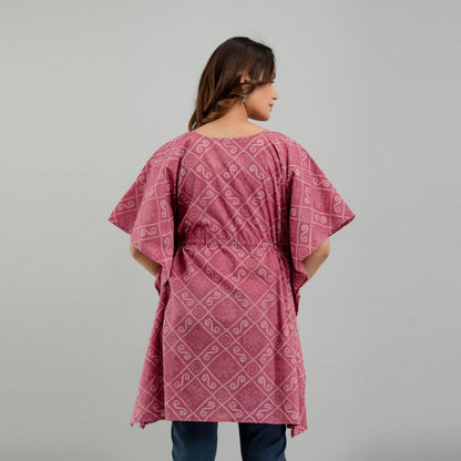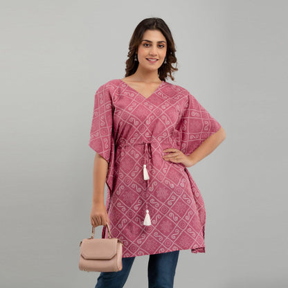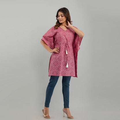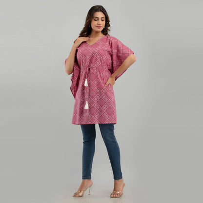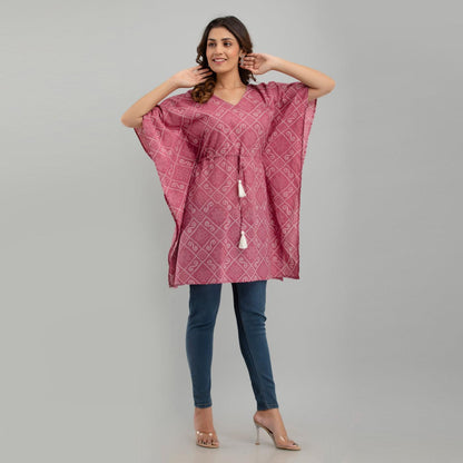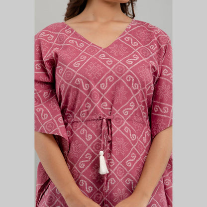 Add this stylish kaftan dress in your wardrobe to stand out and let your outfit speak for you. Stride in perfection and make a fashion statement with this flowy contemporary kaftan dress, amped up with pleasant ethnic print design, V neck, kimono sleeves, drawstring waist tie-up, and graceful appeal. You'll love the sophistication of the print and softness of this fabric. Comfy and stylish in equal parts, this ensemble is a soothing hued beauty. Be it for weddings or dinners, reunions or nightouts, our collection of trendy bandhani print jaipuri Kaftan Dresses is ideal for all occasions. Swing by our collection and add a fun flare to any outfit.