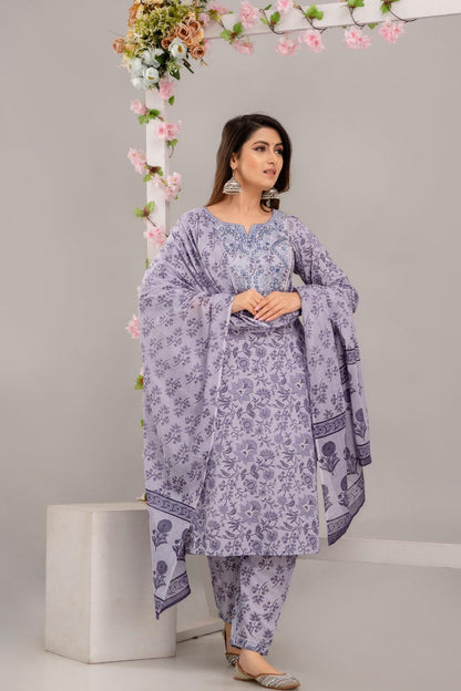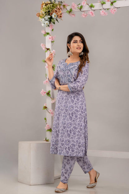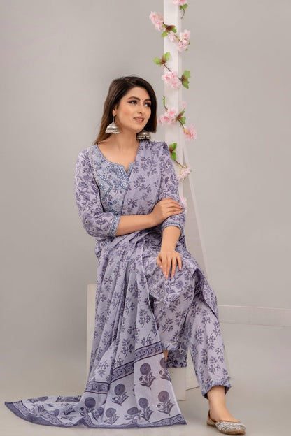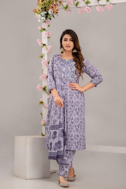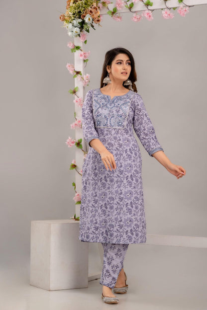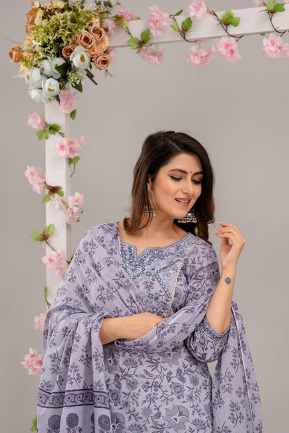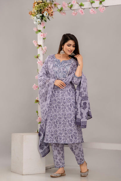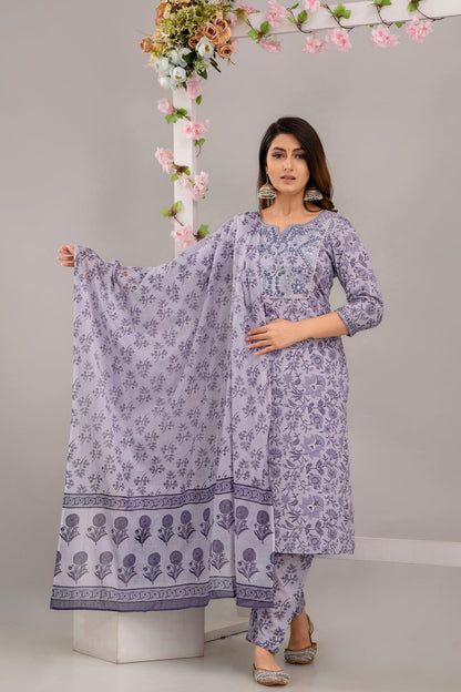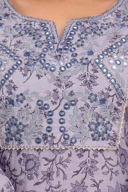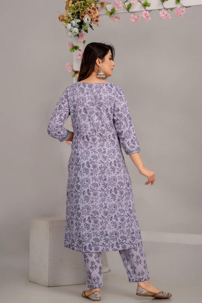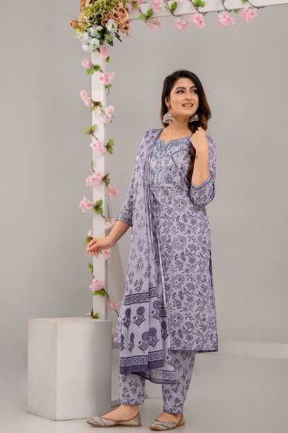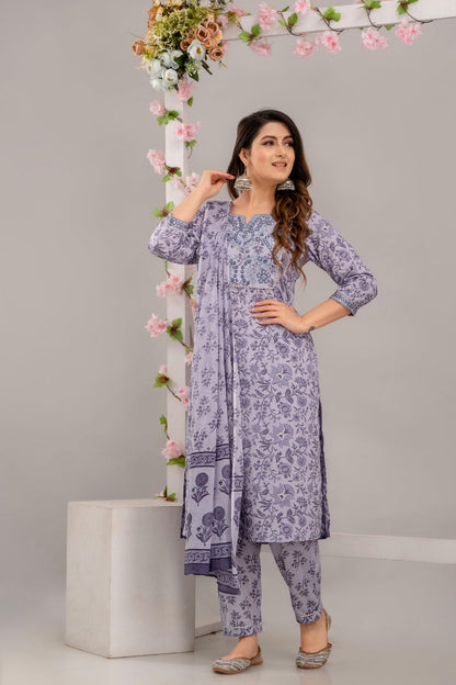 Purple Floral Print with Mirror Work Straight Kurta with Trousers & Dupatta