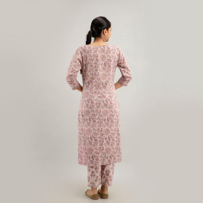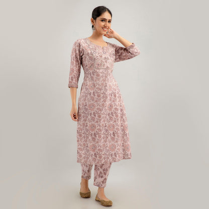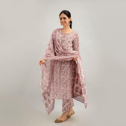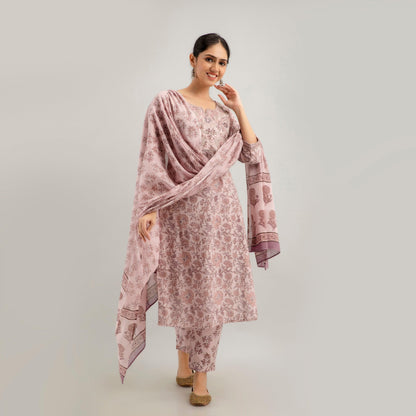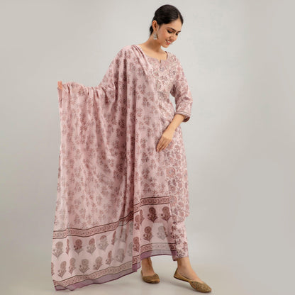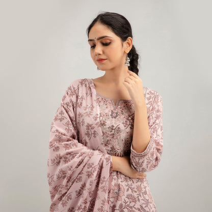 Purple Floral Print with Yoke Design A-Line Kurta with Trousers & Dupatta