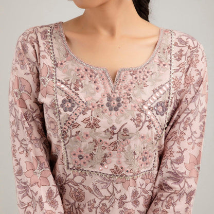Pink straight calf length floral printed kurta, has a mirror work yoke, three-quarter regular sleeves, beads detailing and straight hem.