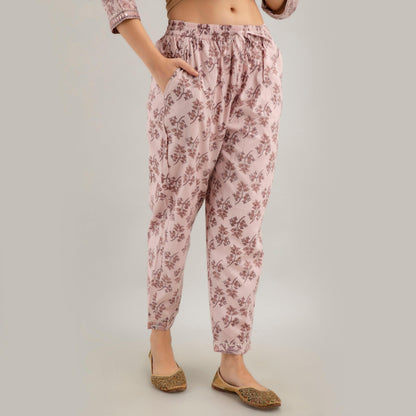Pink printed trousers, has partially elasticated waistband and slip-on closure.