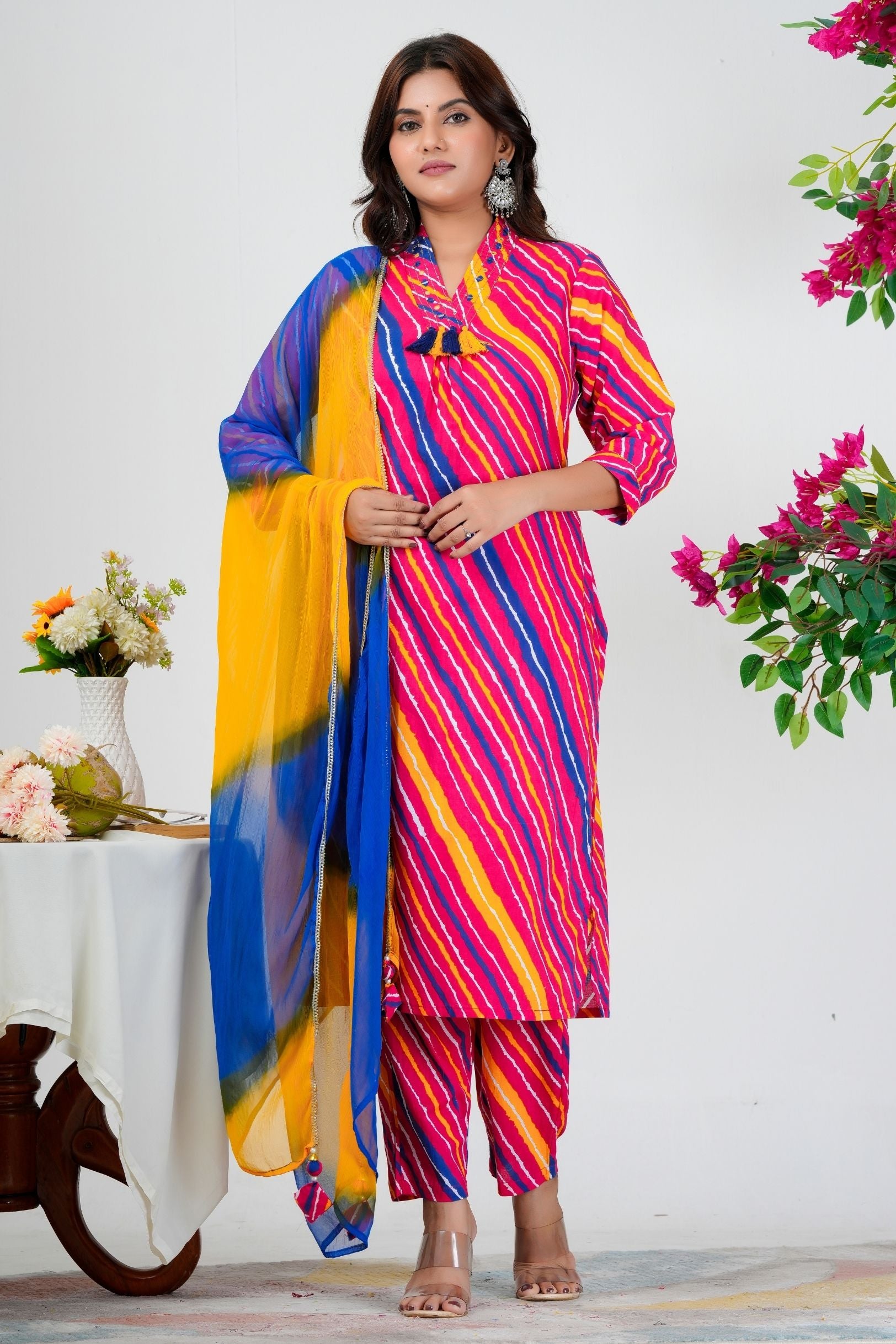 Add a pop of color to your ethnic wardrobe with this radiant kurta set featuring striking multicolor stripes in vibrant hues. Paired with matching bottoms and a flowy ombre dupatta in shades of blue and yellow, this outfit exudes festive charm and playful elegance. Perfect for cultural events, casual outings, or festive gatherings, it’s a stylish blend of tradition and trend.