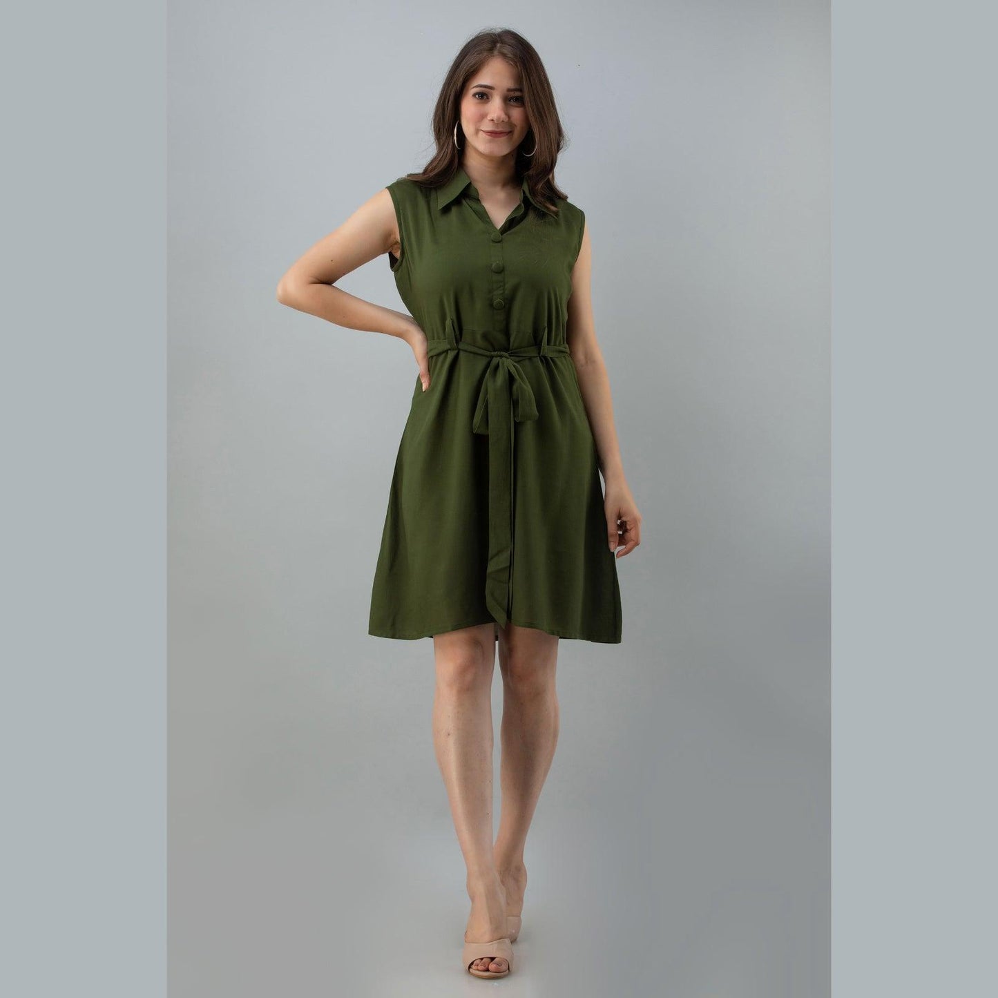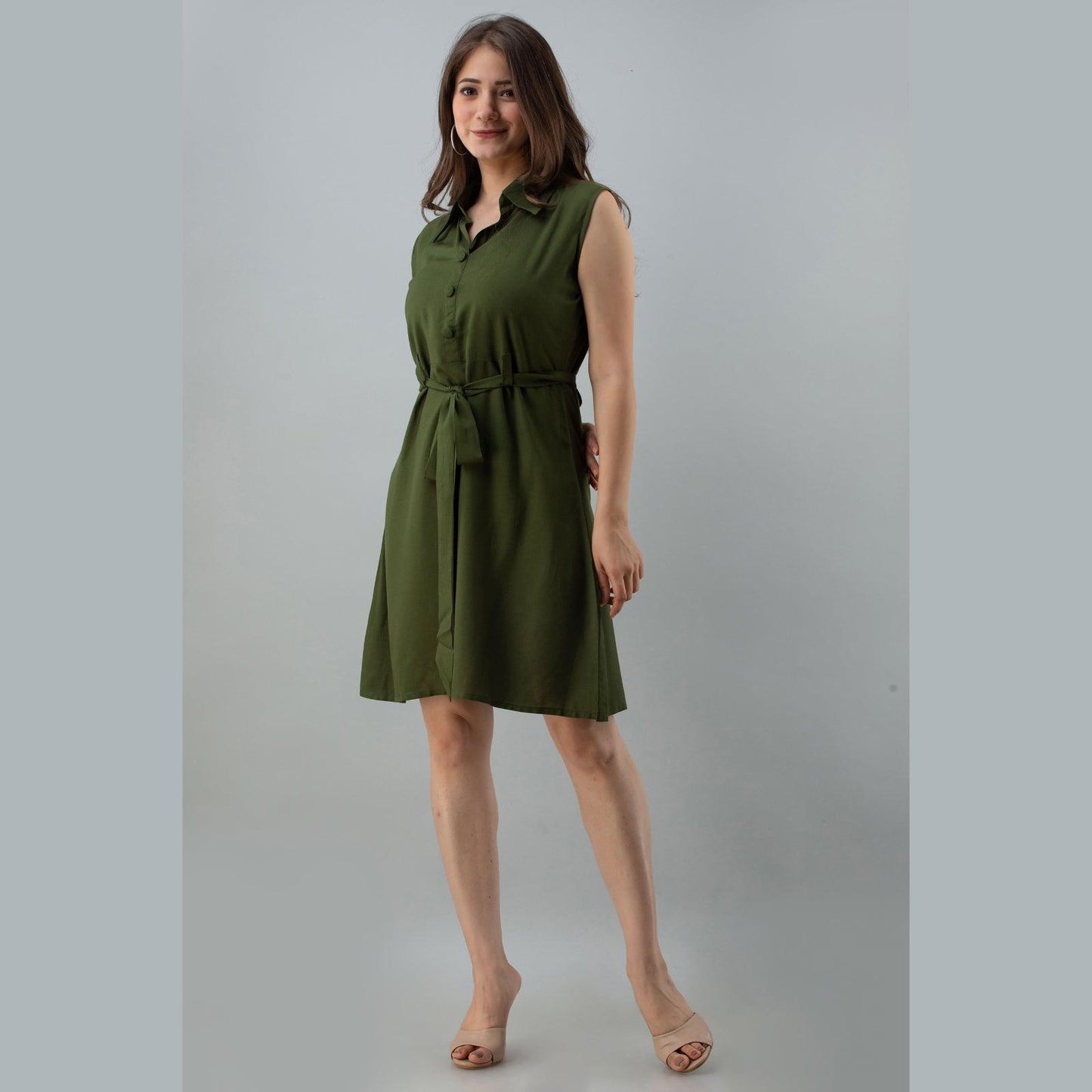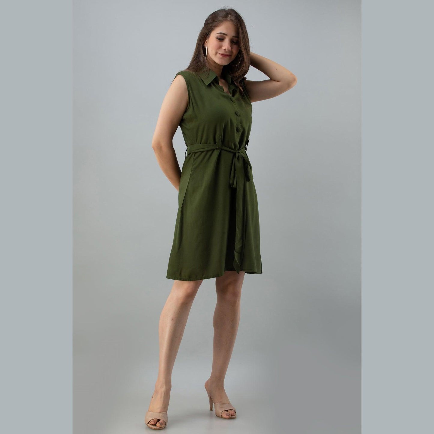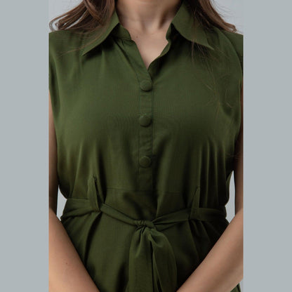 Dark green solid shirt styled top, has a collar neck, sleeveless with drawstring belt and flared hem. Style with fitted pants, block heels and a tote bag for a day out.
