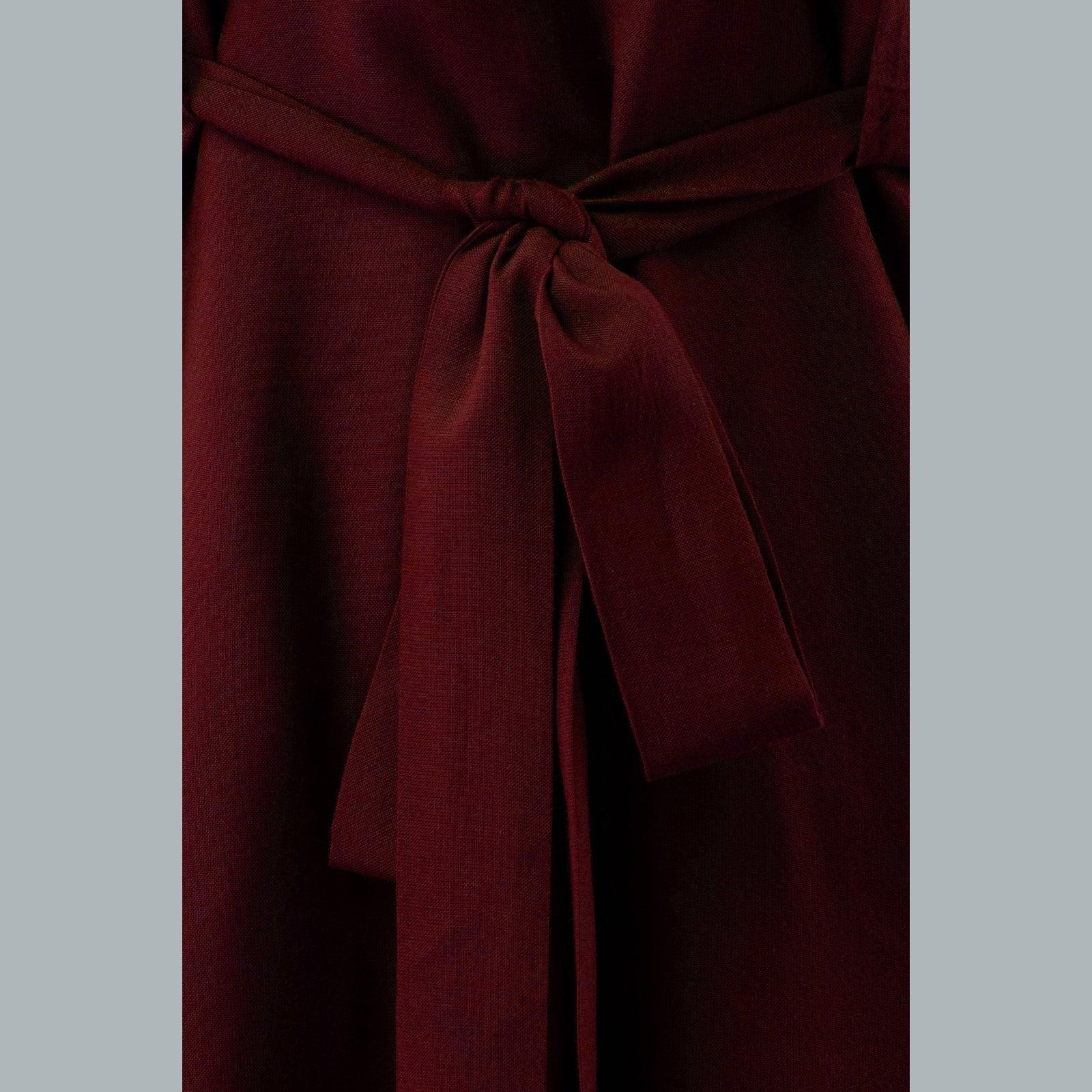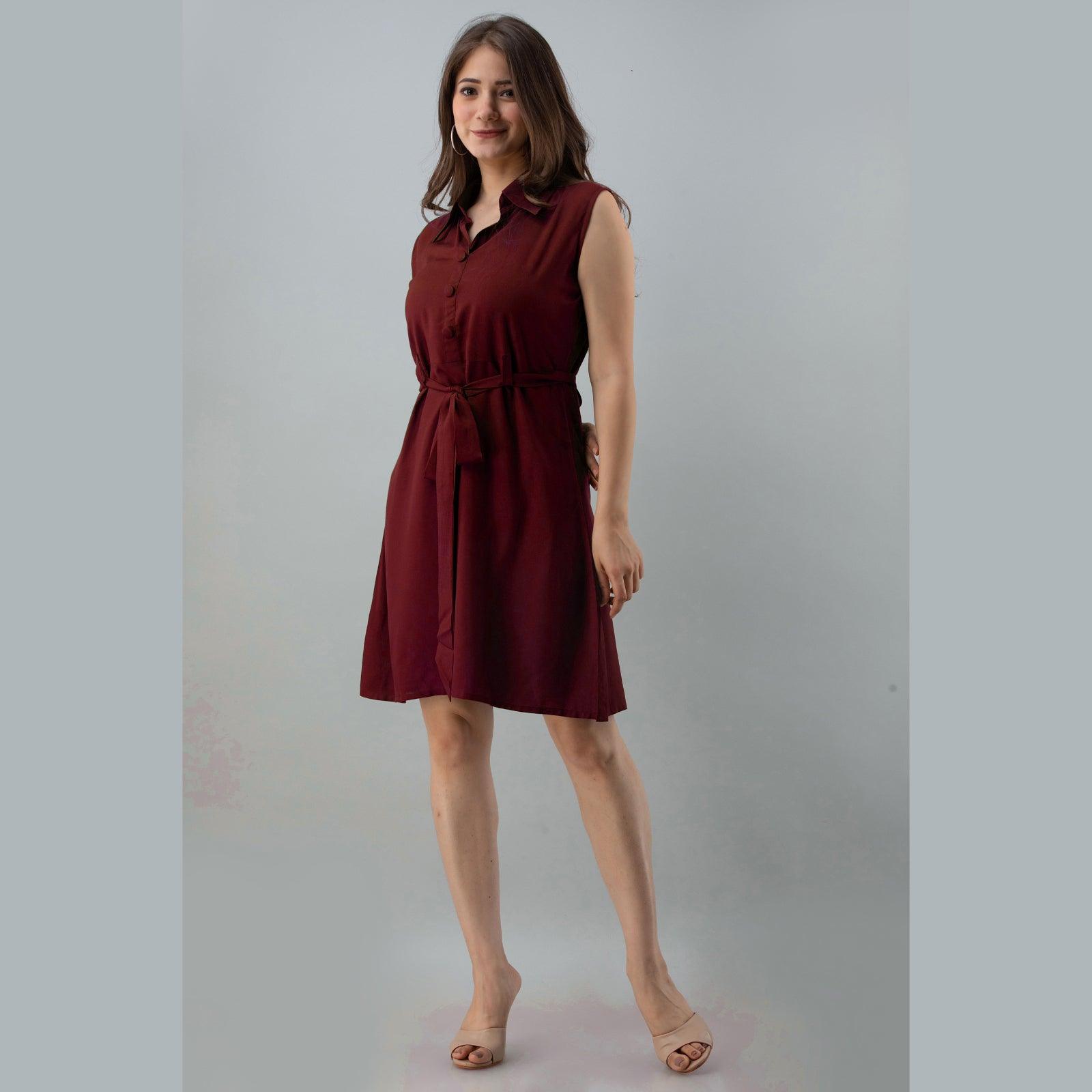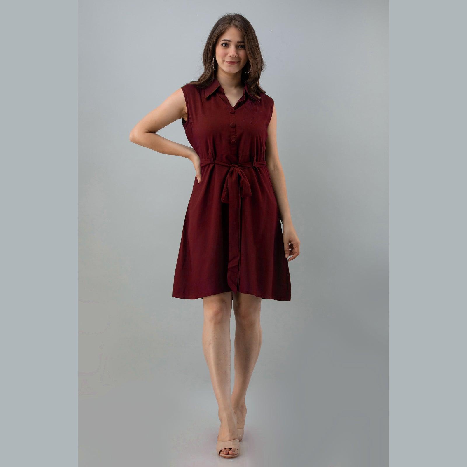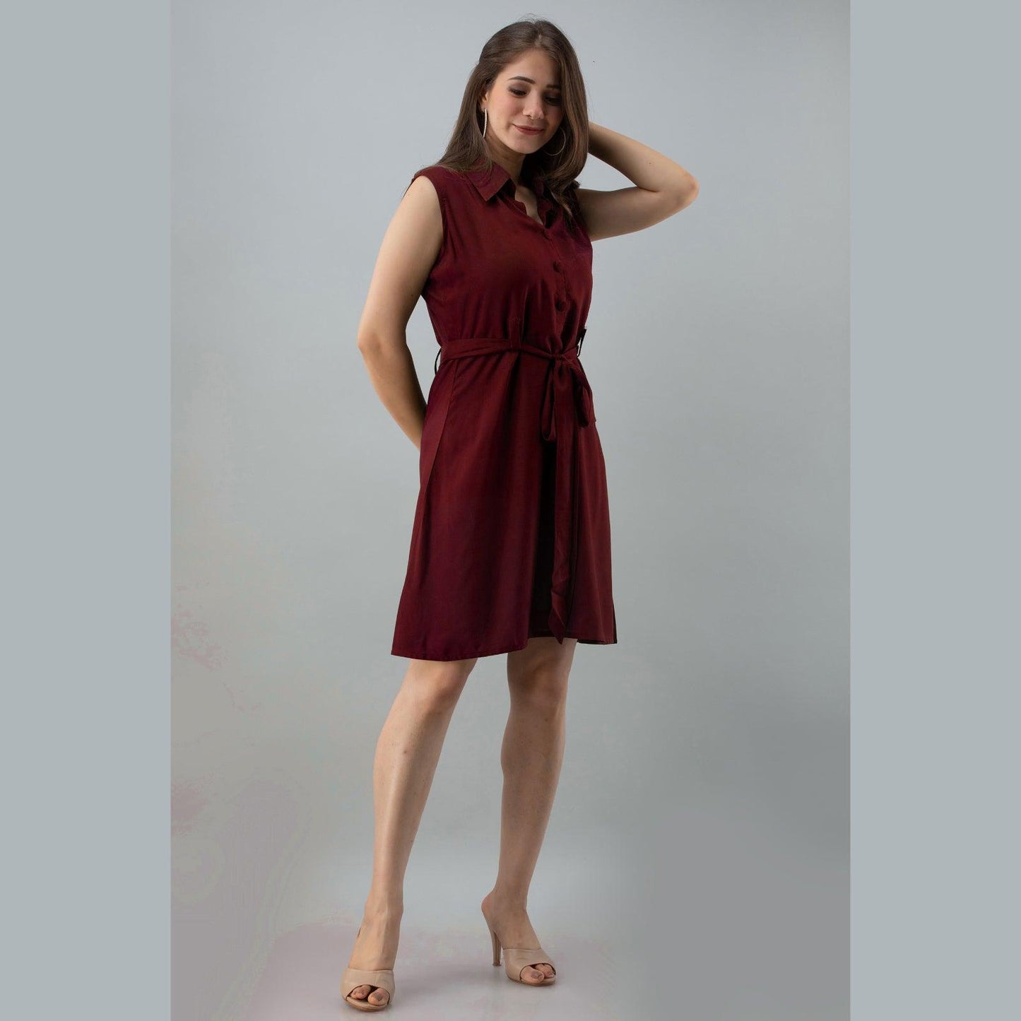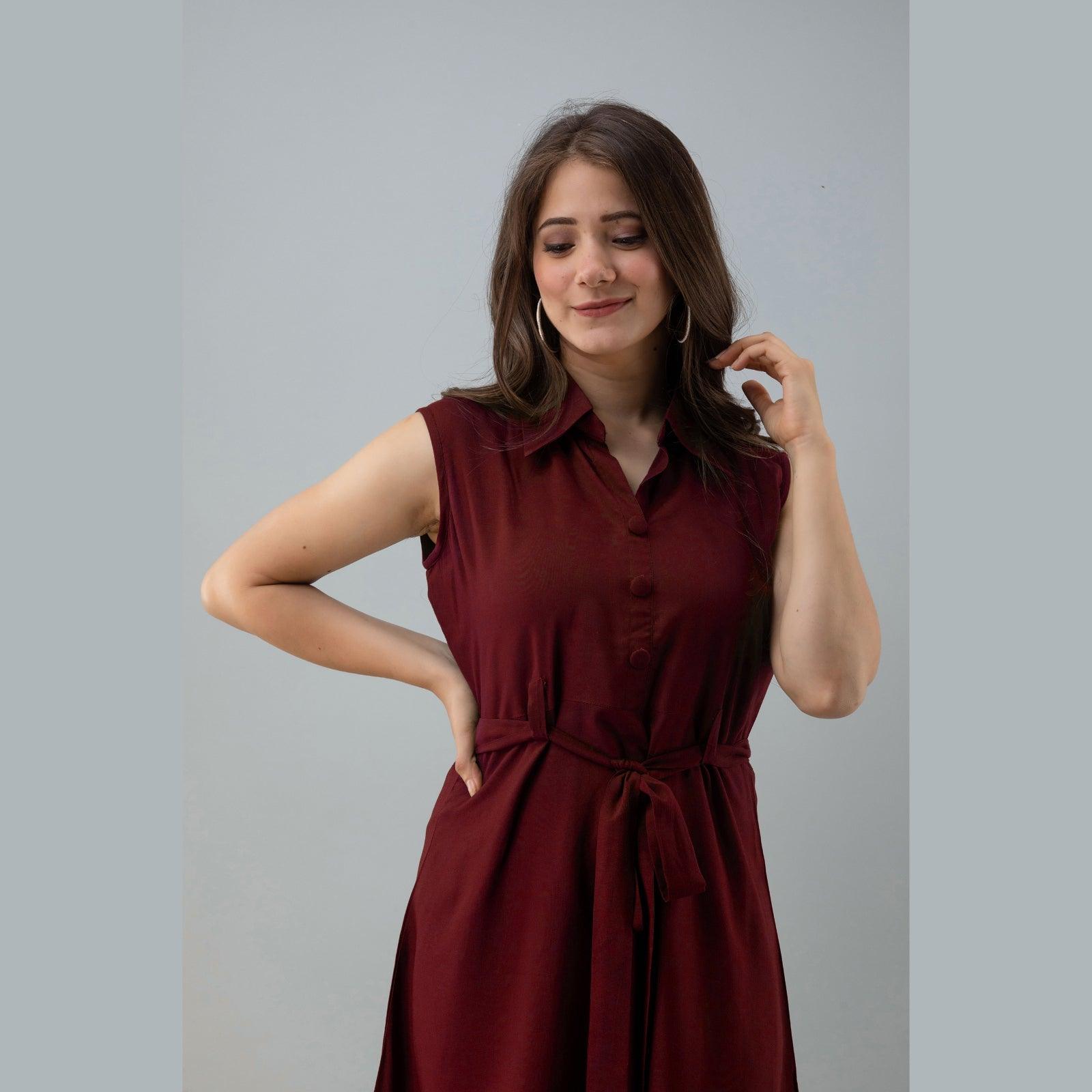 Maroon solid shirt styled top, has a collar neck, sleeveless with drawstring belt and flared hem. Style with fitted pants, block heels and a tote bag for a day out.
