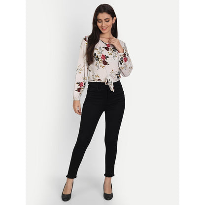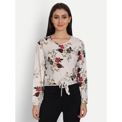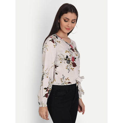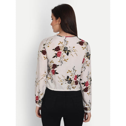 This beutiful white floral print top has a V neck, full sleeves, and tie-up fabric lace at bottom. Made from rayon, it is breathable and comfortable.