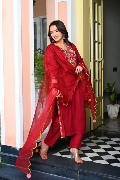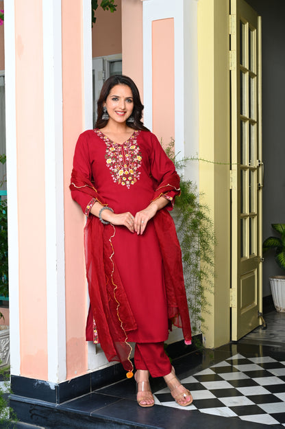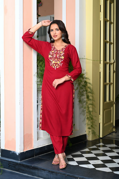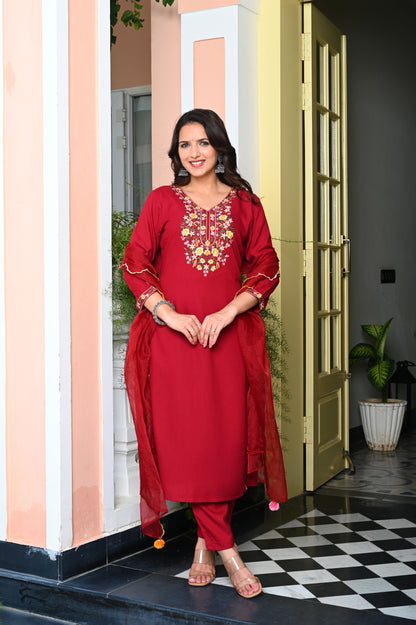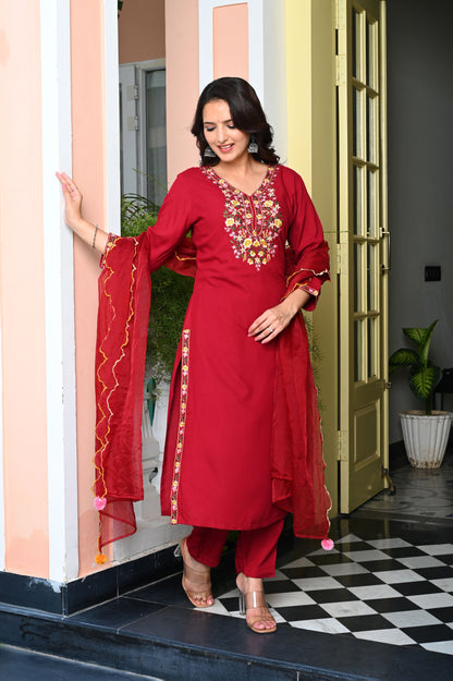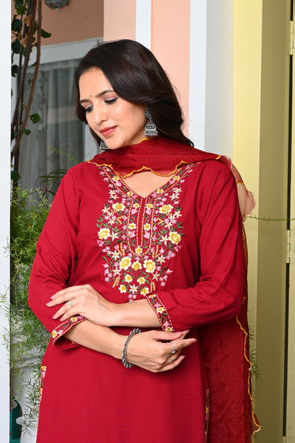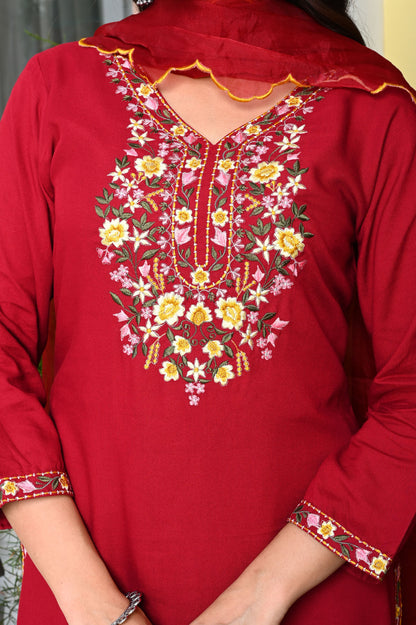 Red Heavy Floral Embroidered Rayon Kurta with Trousers & Organza Dupatta