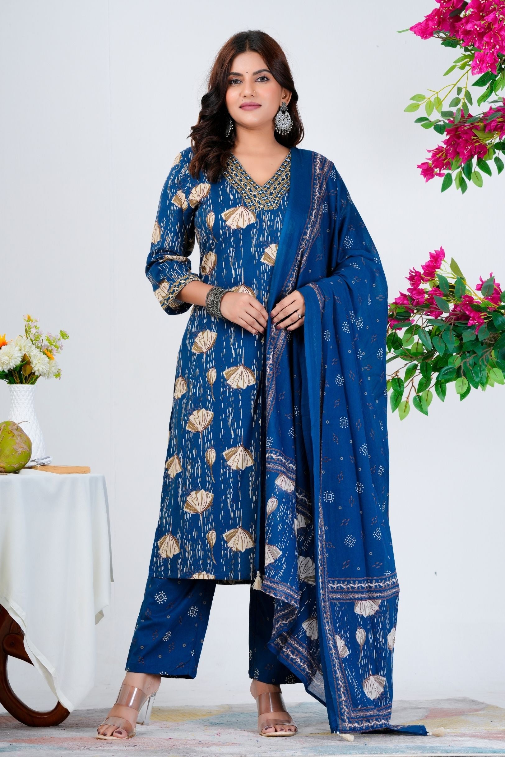 Elevate your ethnic wardrobe with this stunning blue kurta set featuring golden floral prints and an intricately embroidered neckline. Paired with a beautifully patterned dupatta and matching bottoms, this outfit blends tradition with modern elegance—perfect for festive occasions, casual gatherings, and office wear.