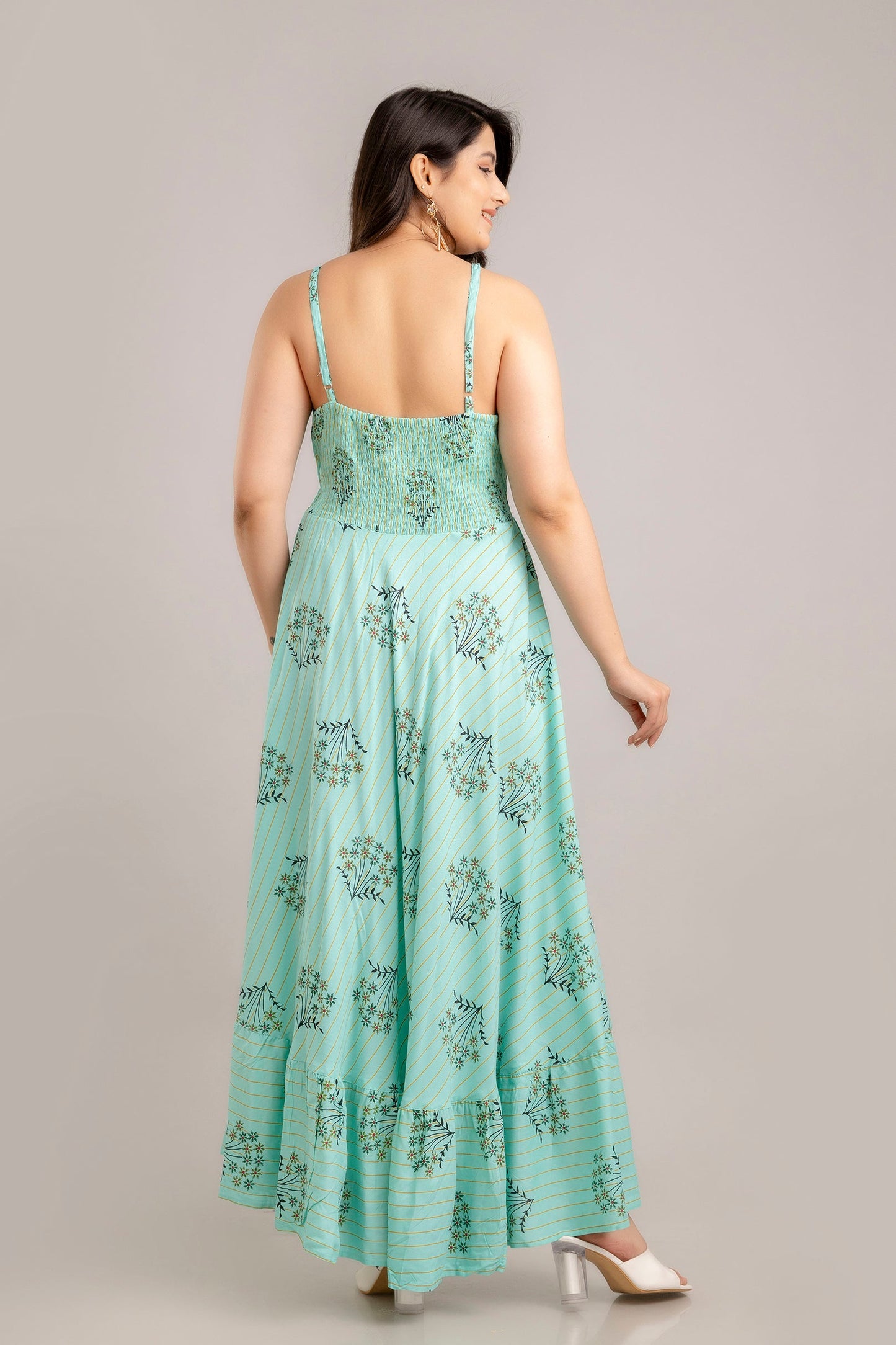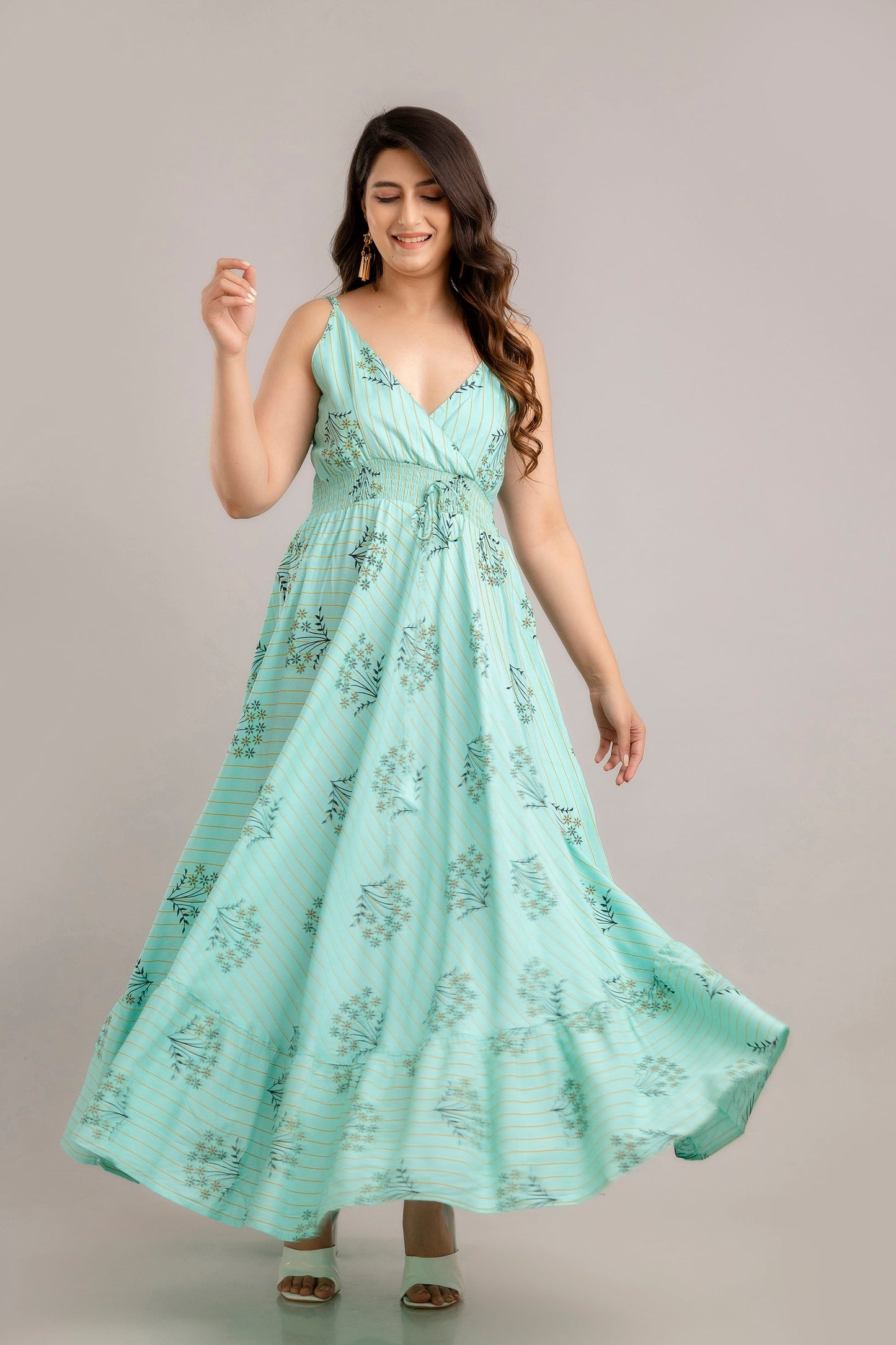 Set the tone for this season with this one-of-a-kind fit & flare dress. Show up to your work event in style by pairing this piece with caged heels and a cute blazer. A perfect dress with smocked design, sleeveless and V neck. When you need an outfit for work and dinner after work, wear this stylish piece with platform heels and some minimalistic silver jewellery..