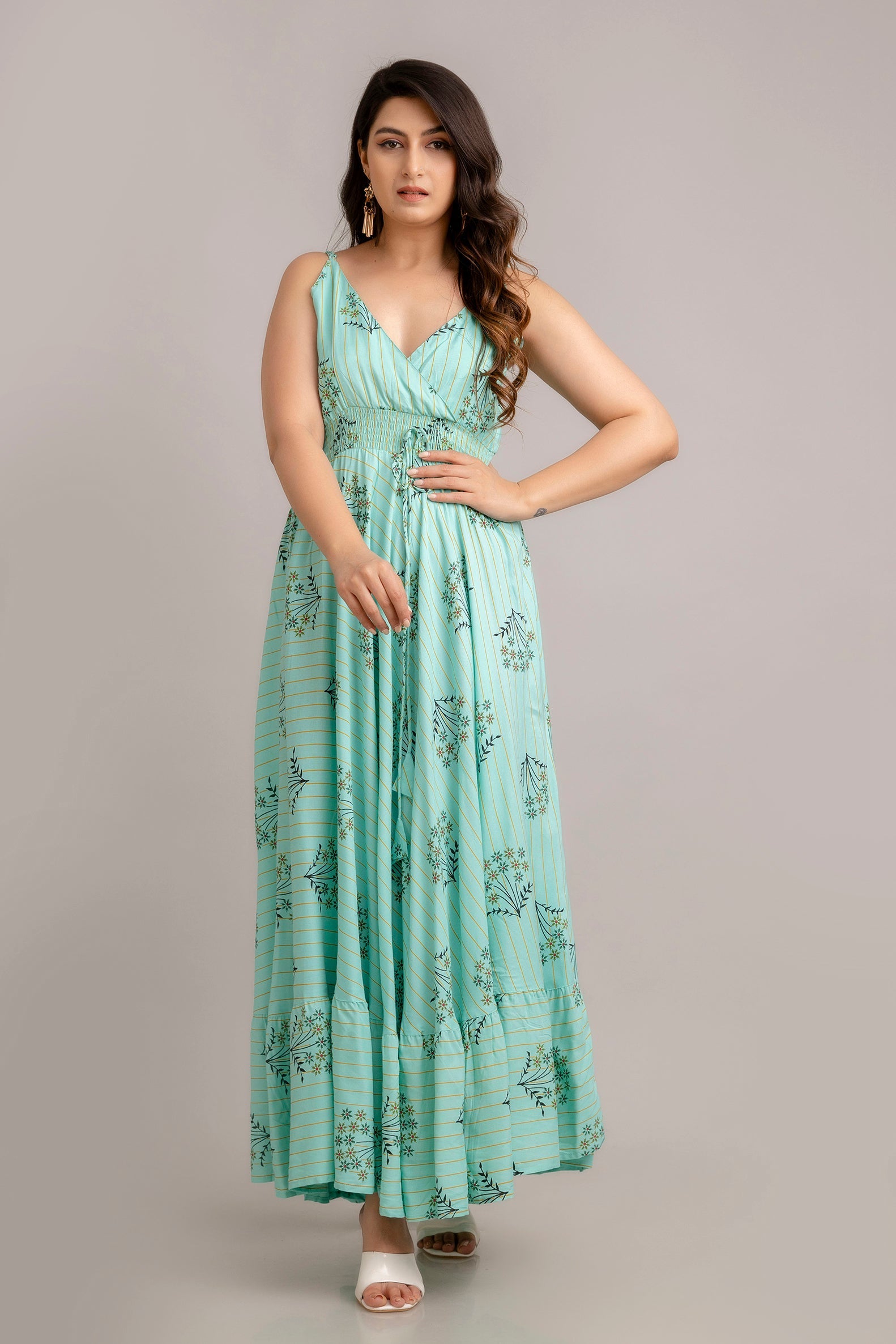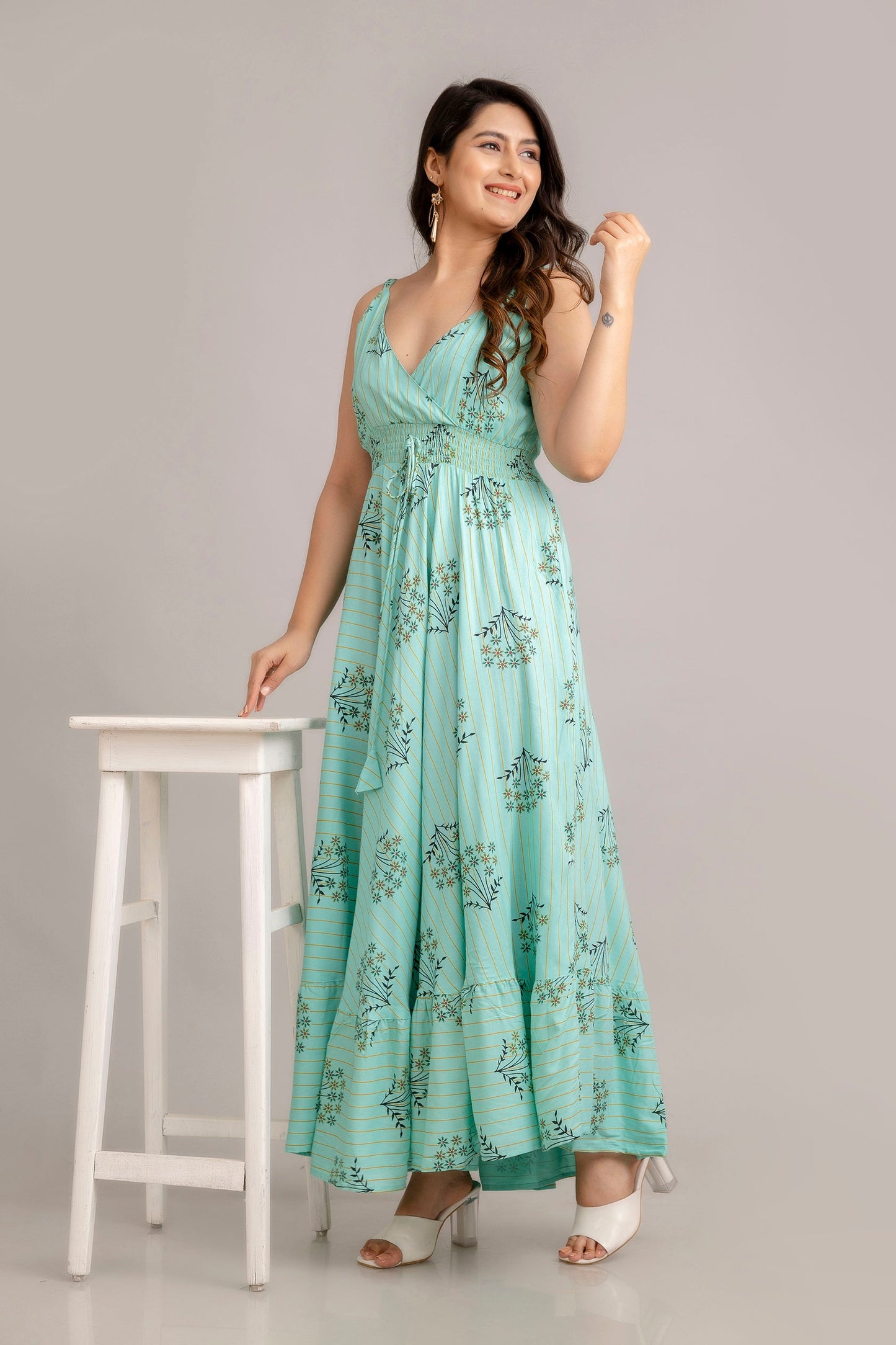 Turn heads this season in this effortlessly stylish dress by FrionKandy. Team this floral turquoise blue piece with a pair of heels or gladiators and a statement sling bag for a perfect brunch look.