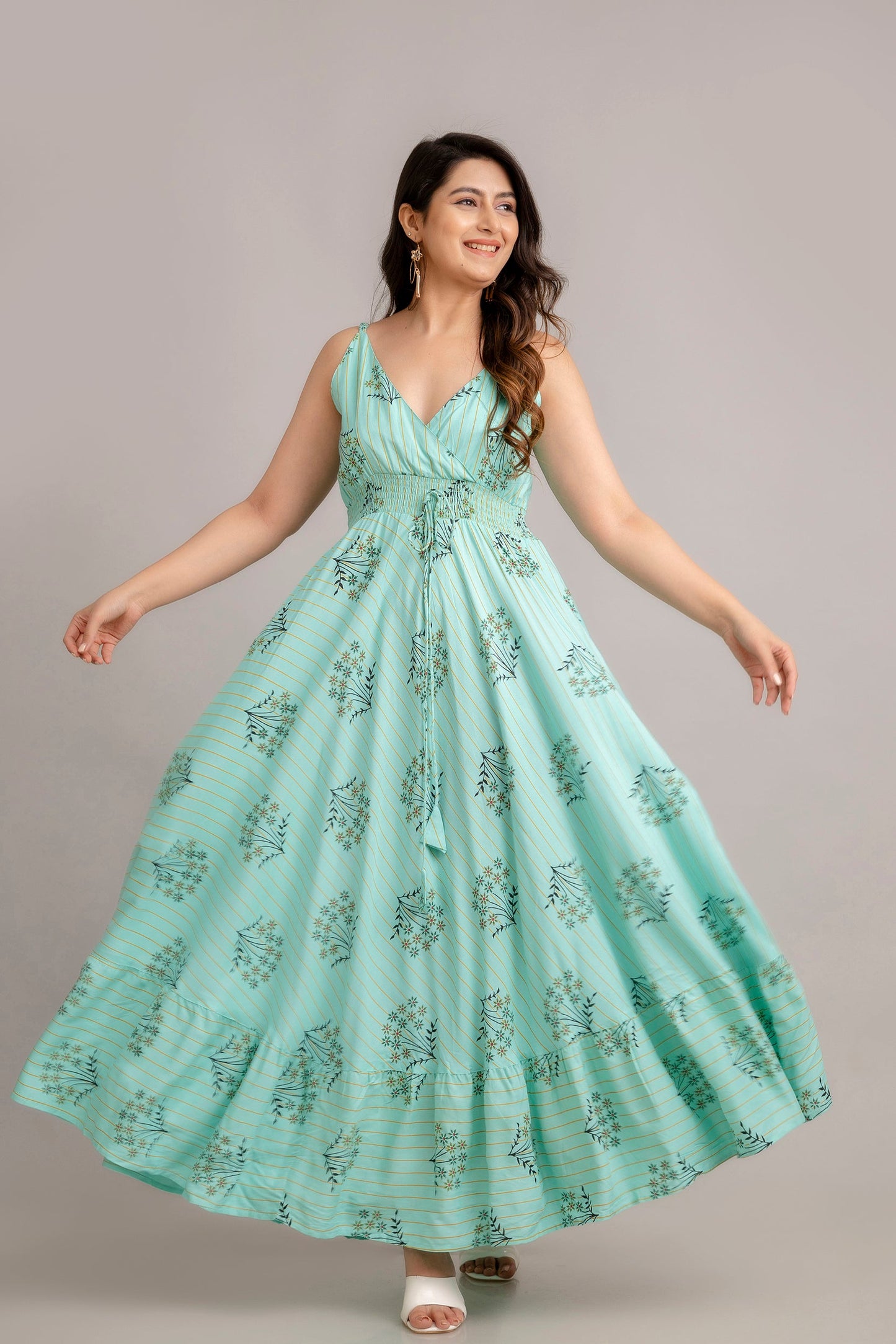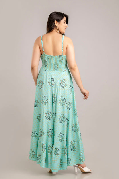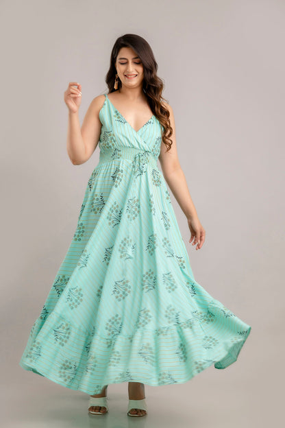 Turquoise Blue Floral Printed Sleeveless Fit and Flare Maxi Dress - SHKUP1364