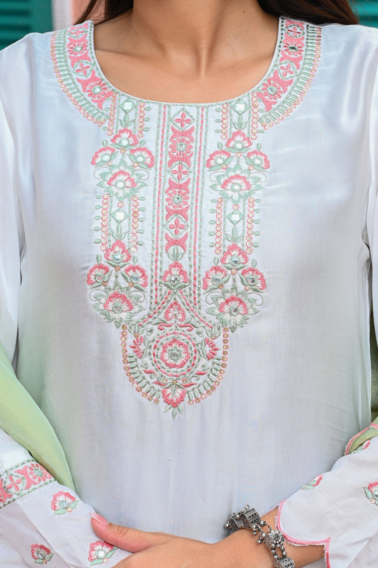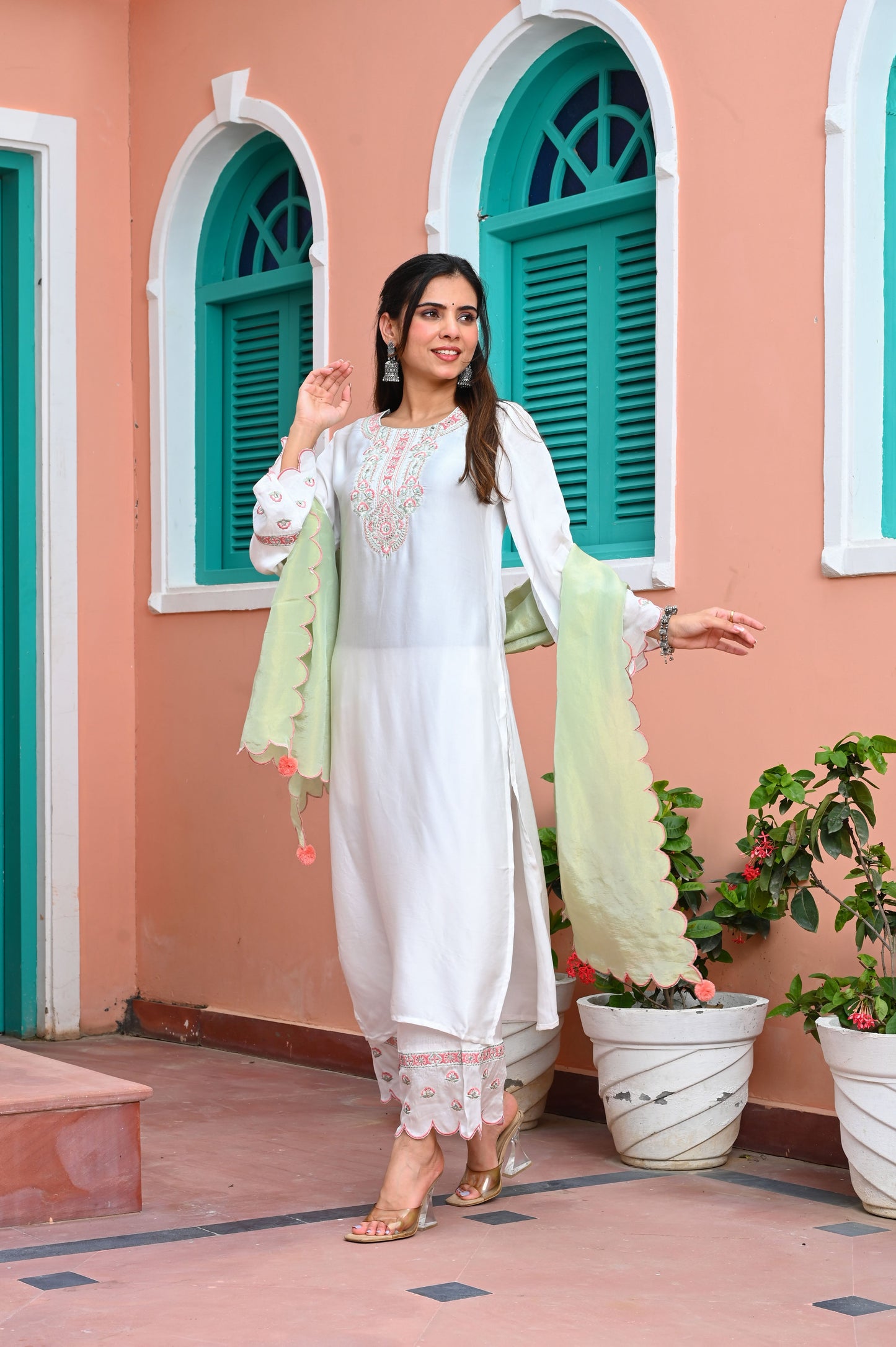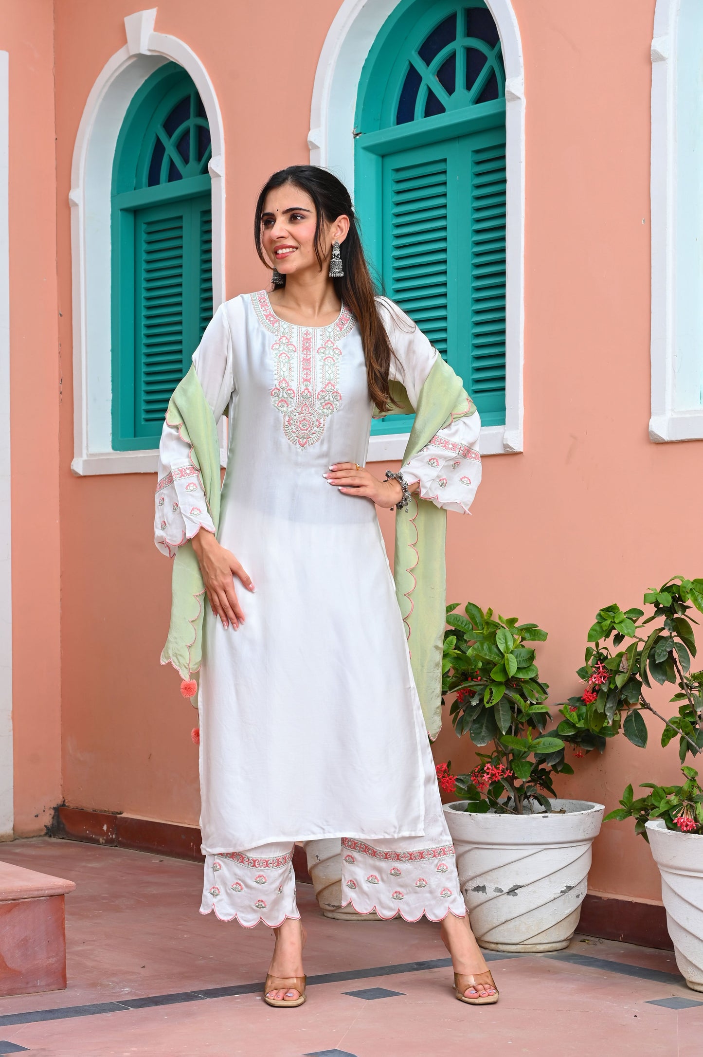 White & Pink Floral Embroidered Muslin Kurta with Trousers & Dupatta
