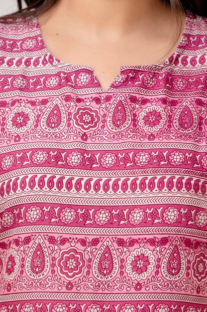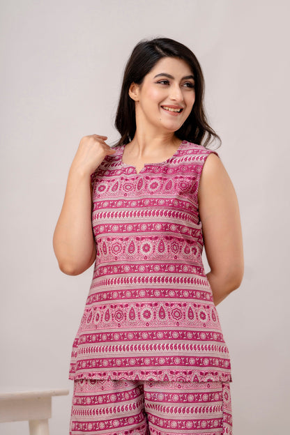 Look stylish even when you're off to bed by wearing this chic night suit. It flaunts an attractive round neck with sleeveless for enhanced appeal. This chic set is comfortable as well as feminine, making it a perfect wear for a relaxed evening at home. Club those fluffy room slippers with this one to soak in a chill vibe.You can simply unfurl yourself into the embrace of this night suit to unwind after a long day at work. This one is crafted with the softest fabric to leave you feeling light and airy.