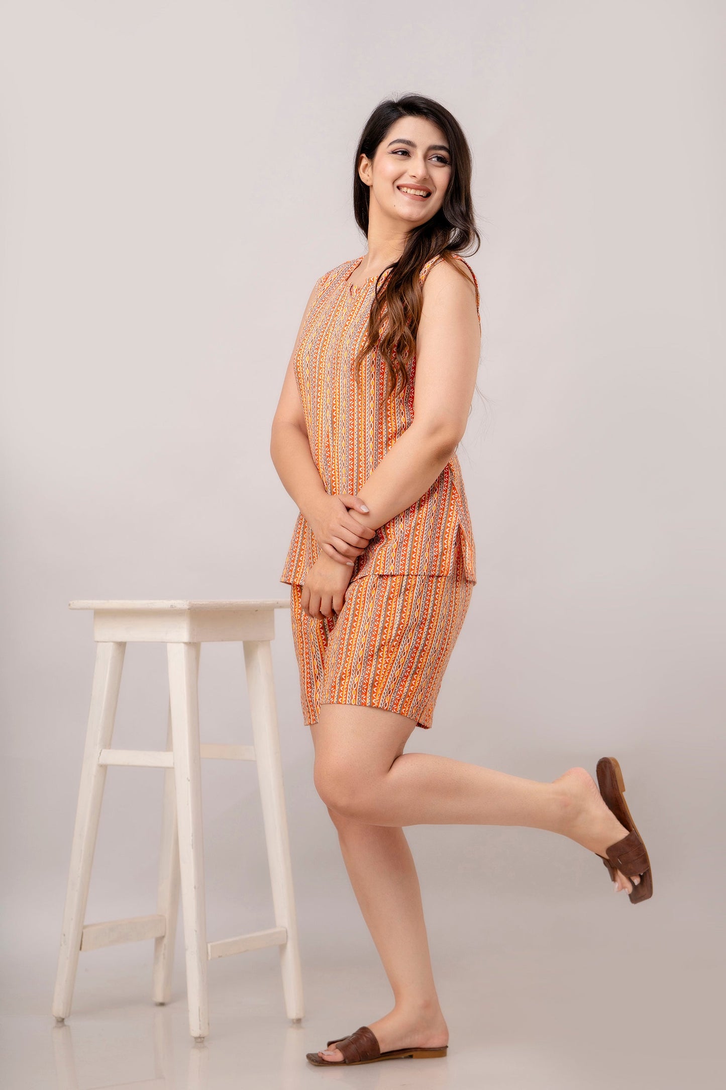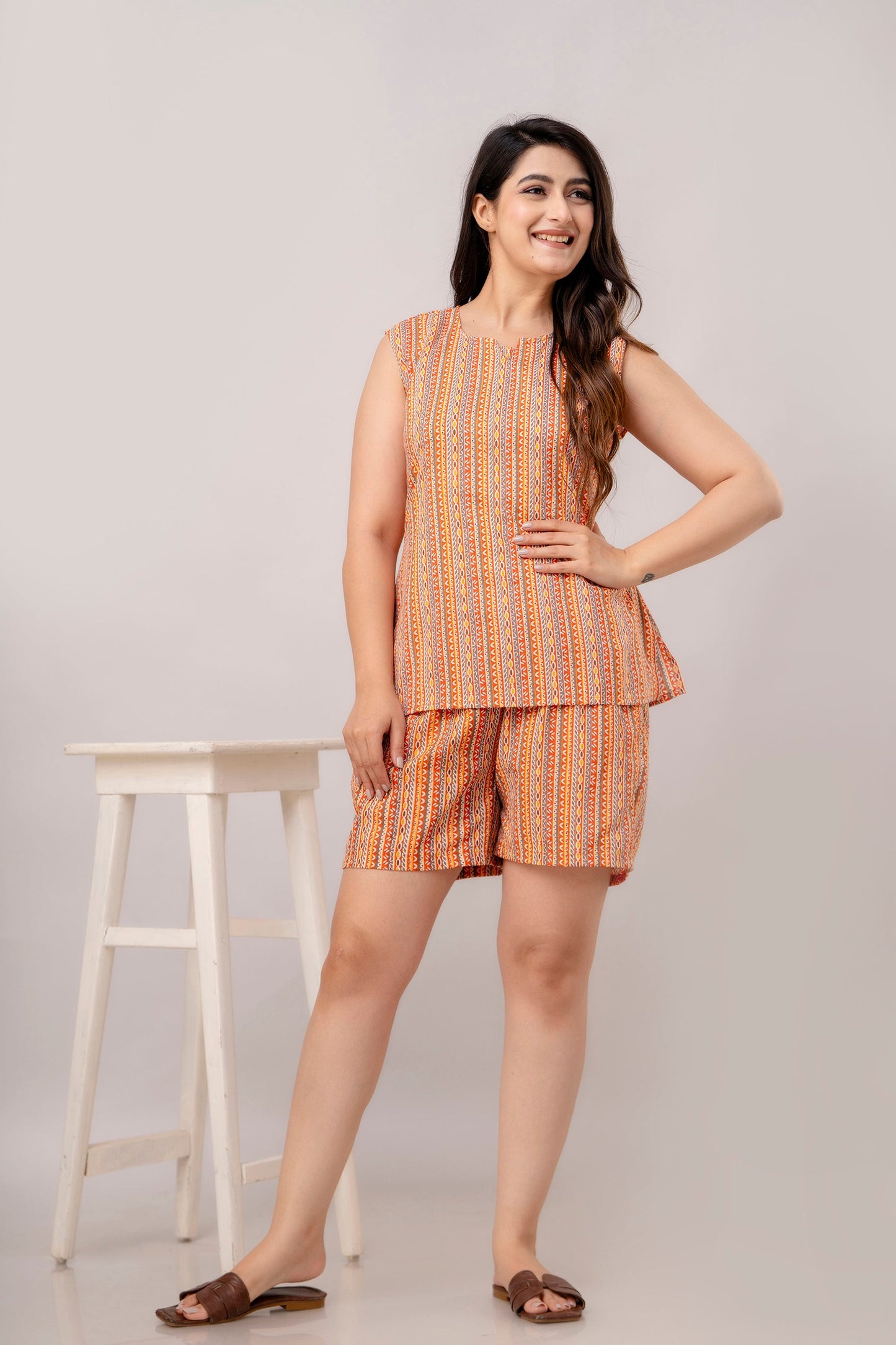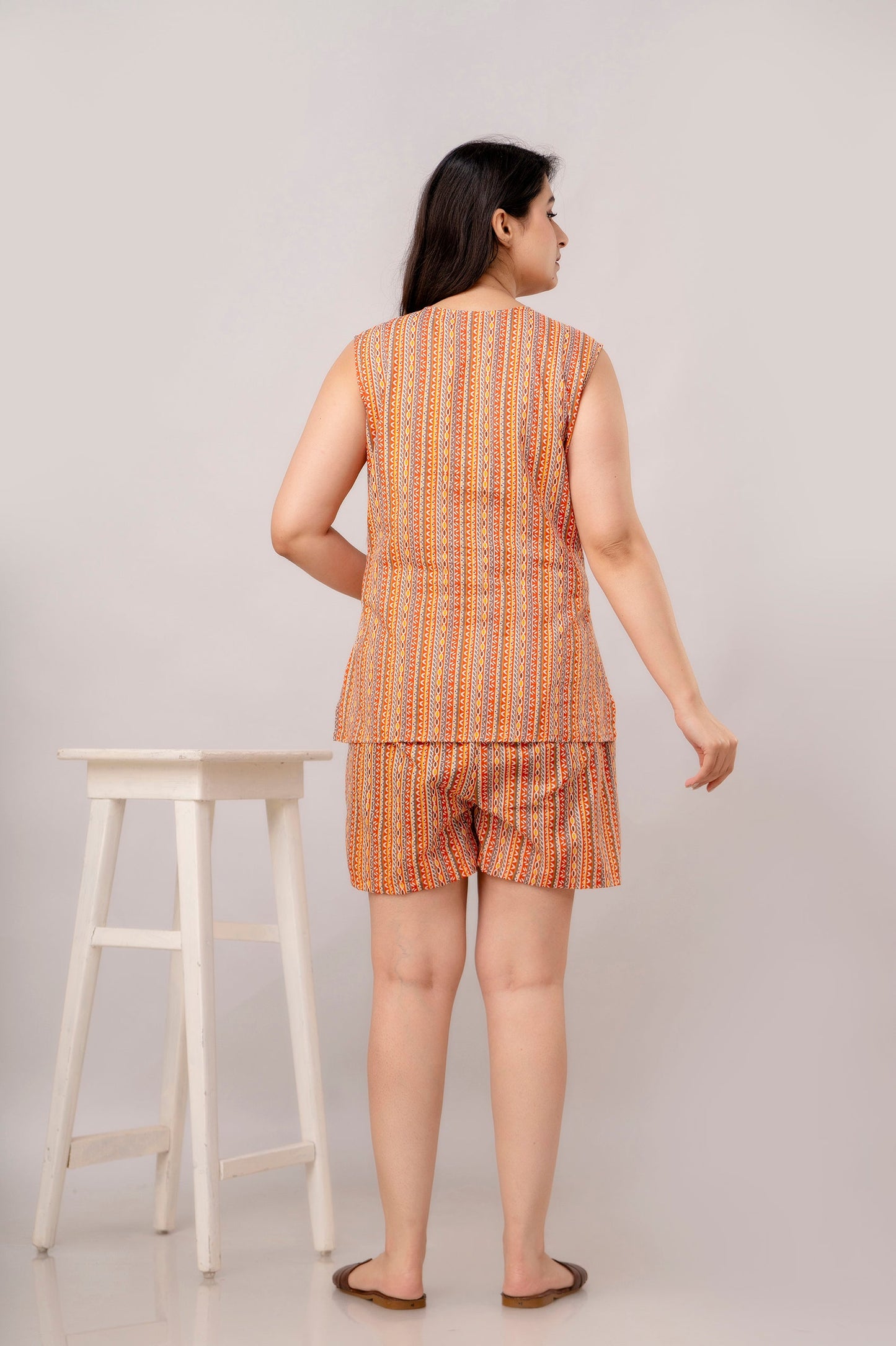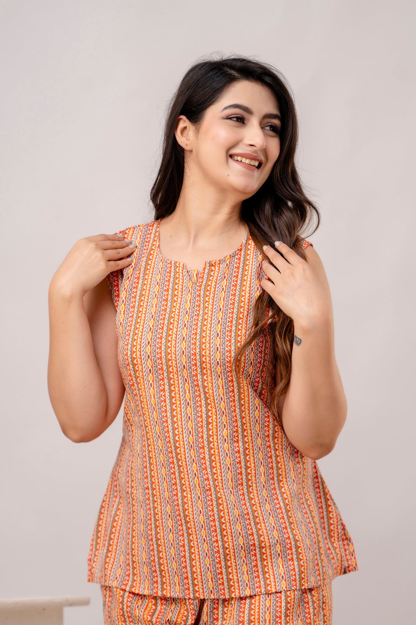 Look stylish even when you're off to bed by wearing this chic night suit. It flaunts an attractive round neck with sleeveless for enhanced appeal. This chic set is comfortable as well as feminine, making it a perfect wear for a relaxed evening at home. Club those fluffy room slippers with this one to soak in a chill vibe.You can simply unfurl yourself into the embrace of this night suit to unwind after a long day at work. This one is crafted with the softest fabric to leave you feeling light and airy.