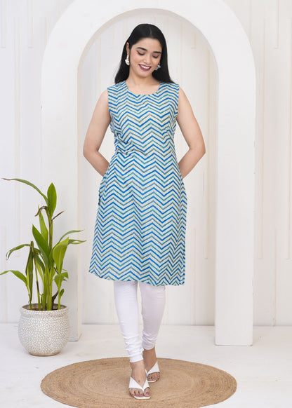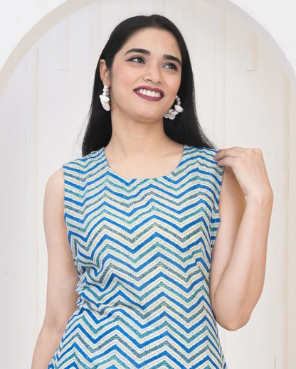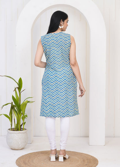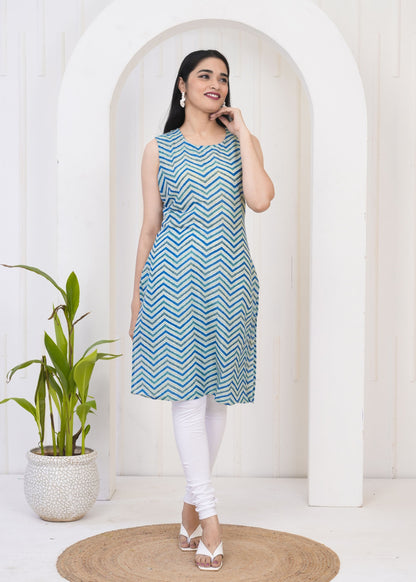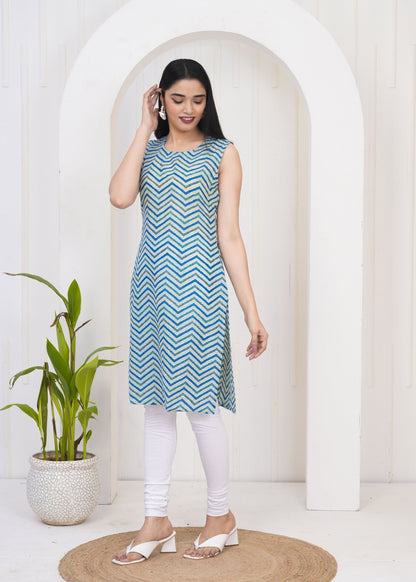 Blue Chevron/Zig Zag Pure Cotton Straight Kurti, has a round round neck, sleeveless, straight hem with side slits.