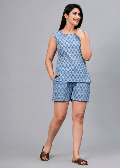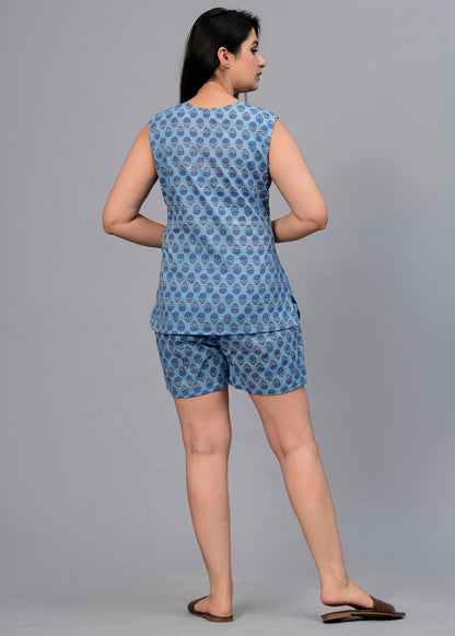 Look stylish even when you're off to bed by wearing this chic night suit. It flaunts an attractive round neck with sleeveless for enhanced appeal. This chic set is comfortable as well as feminine, making it a perfect wear for a relaxed evening at home. Club those fluffy room slippers with this one to soak in a chill vibe.You can simply unfurl yourself into the embrace of this night suit to unwind after a long day at work. This one is crafted with the softest fabric to leave you feeling light and airy.