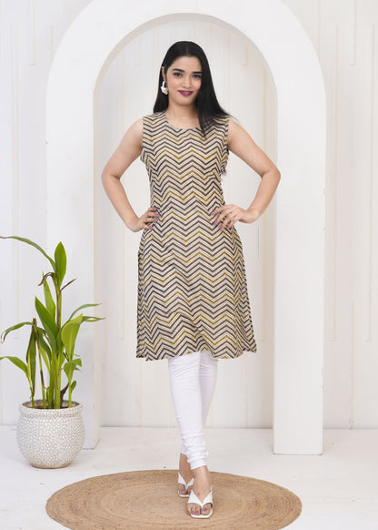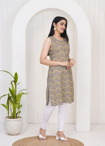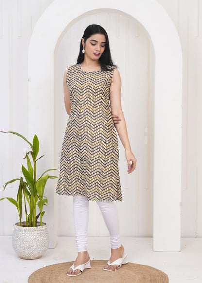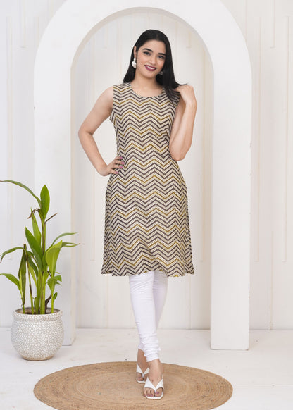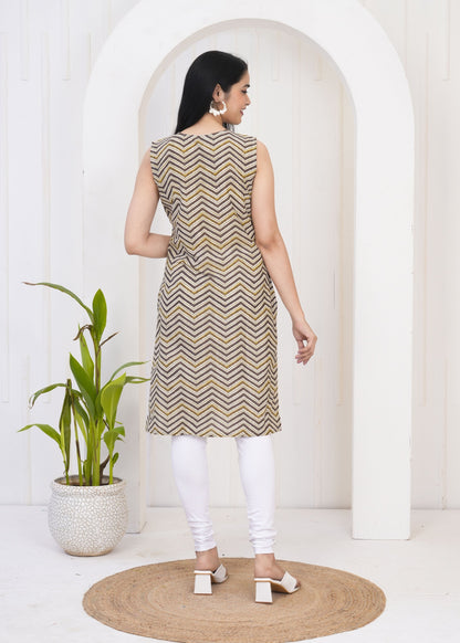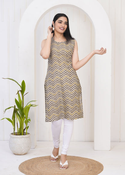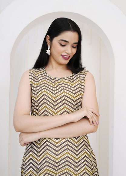 Brown Chevron/Zig Zag Pure Cotton Straight Kurti, has a round round neck, sleeveless, straight hem with side slits.