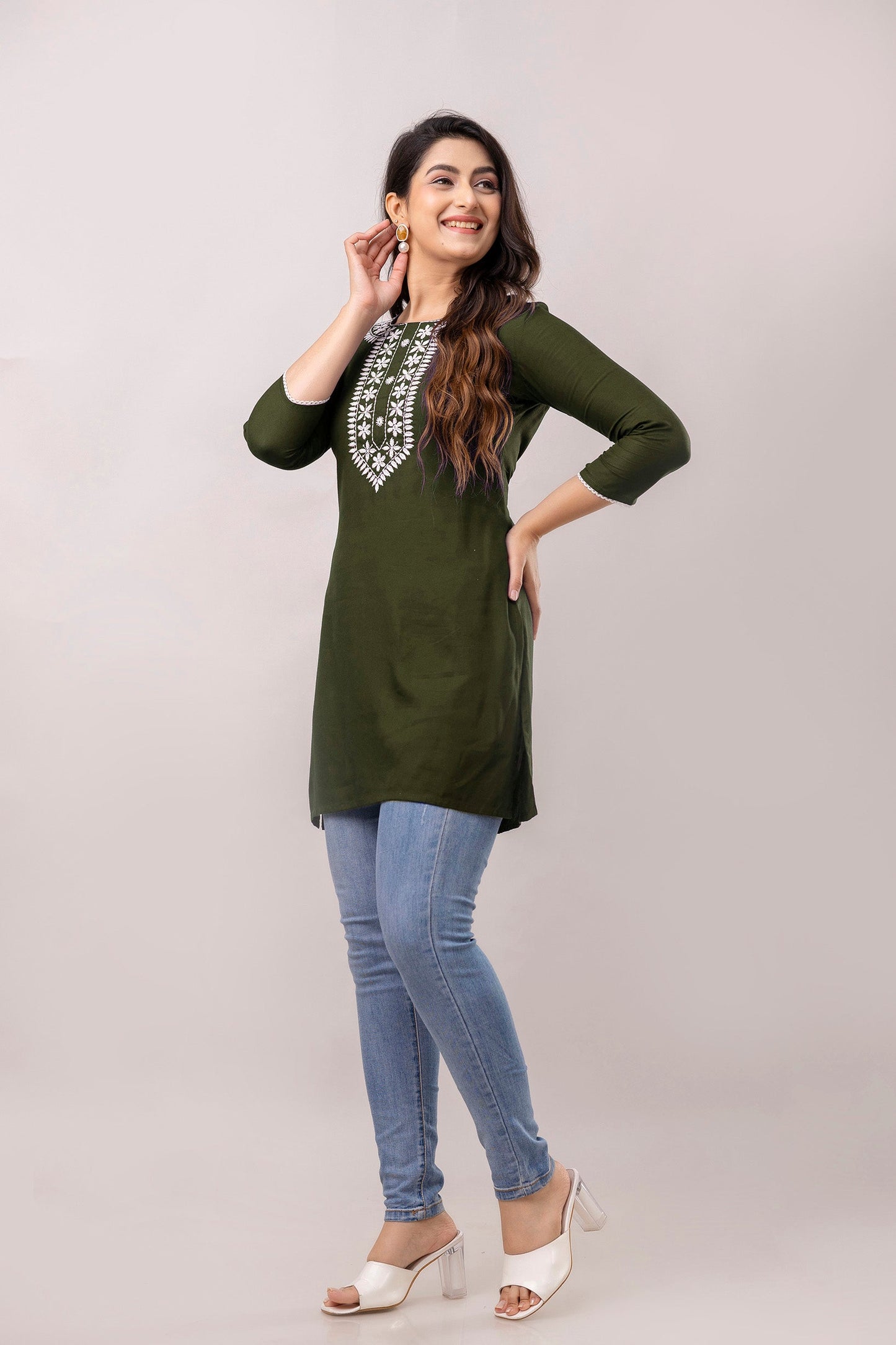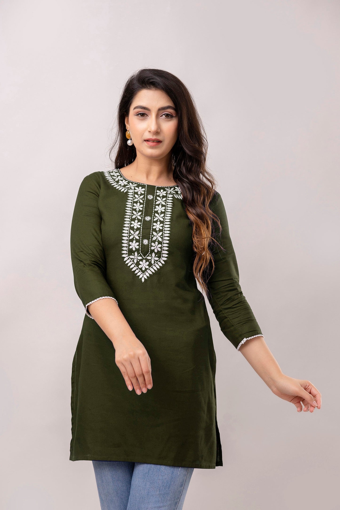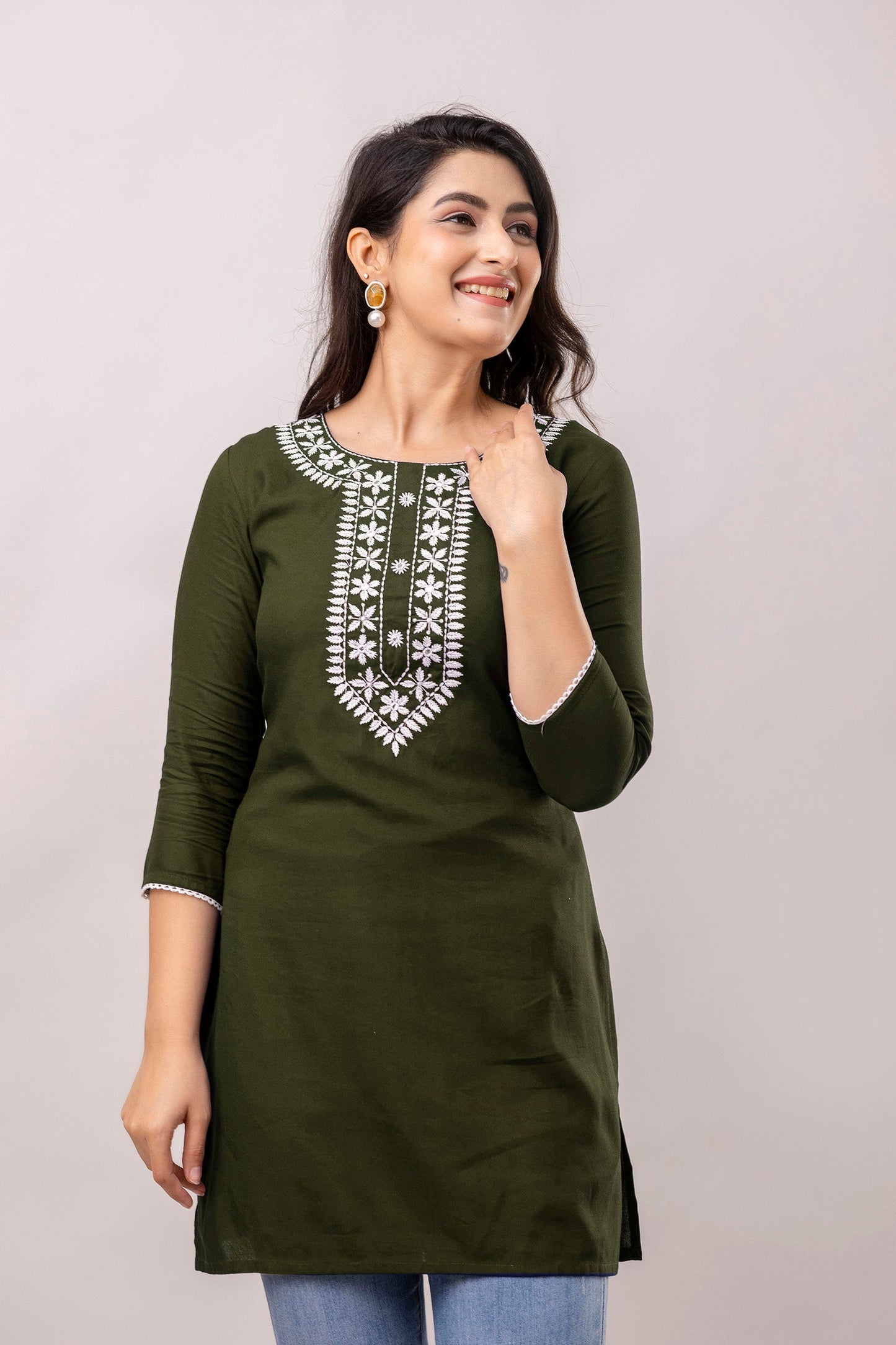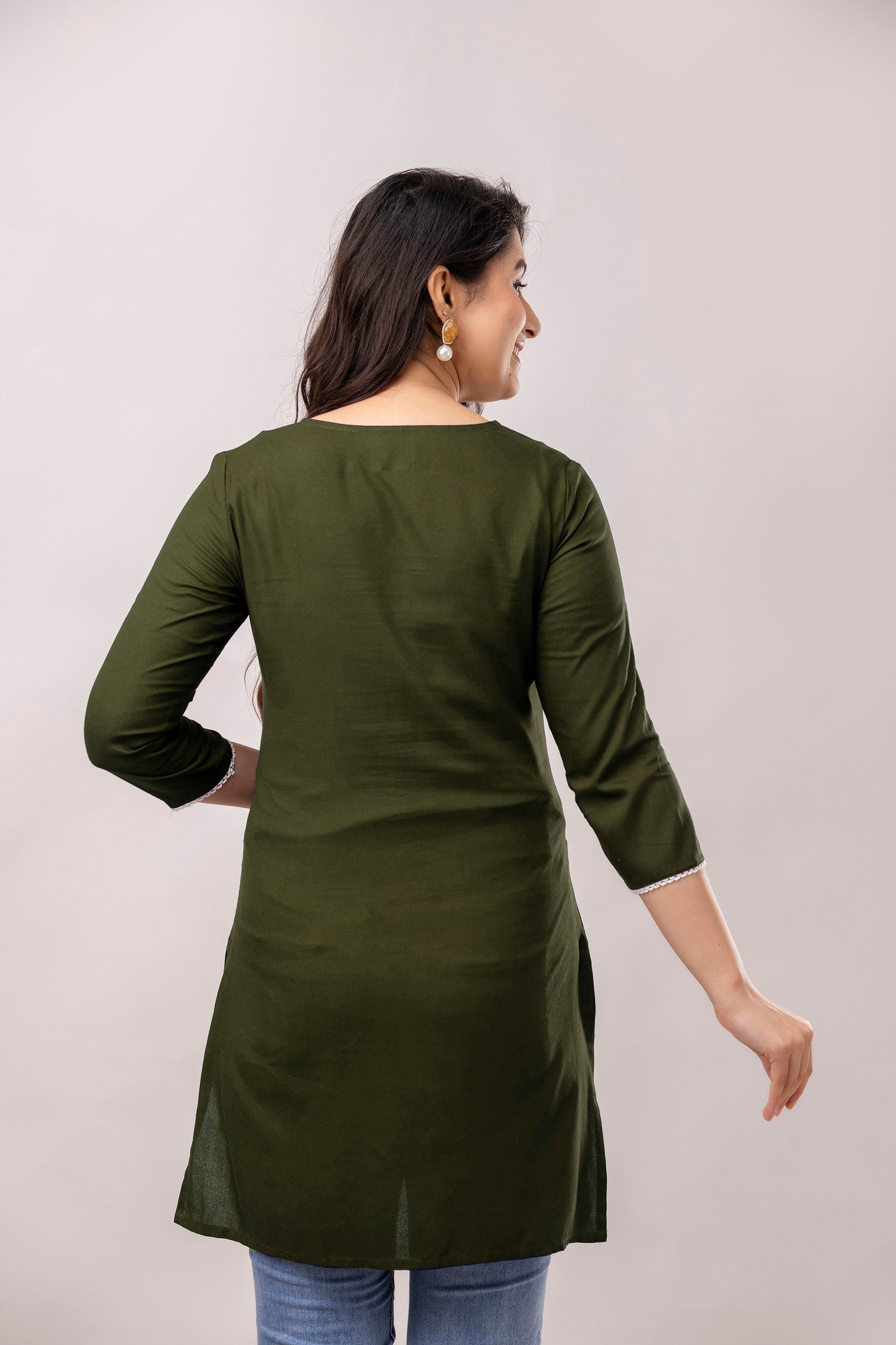 Turn heads this season in this effortlessly stylish short kurti by FrionKandy. Team this dark green yoke design piece with a pair of heels or gladiators and a statement sling bag for a perfect brunch look.