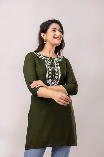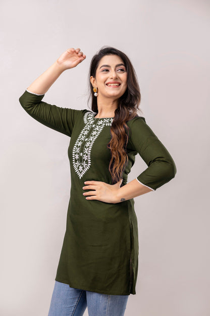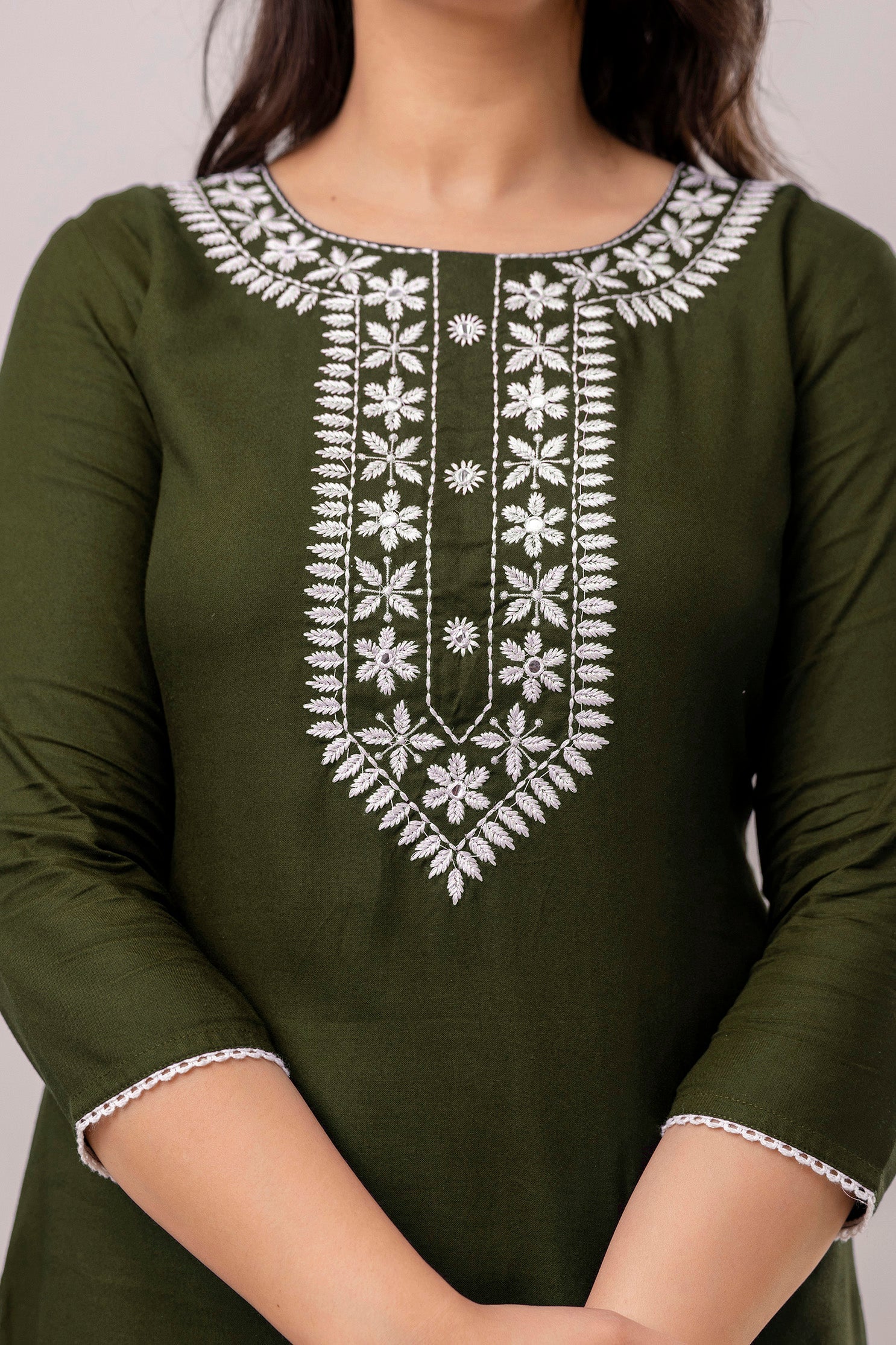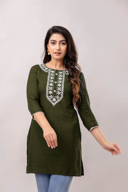 Dark green and white chawal taka embroidered straight kurti, has a round round neck, three-quarter sleeves, straight hem with side slits.