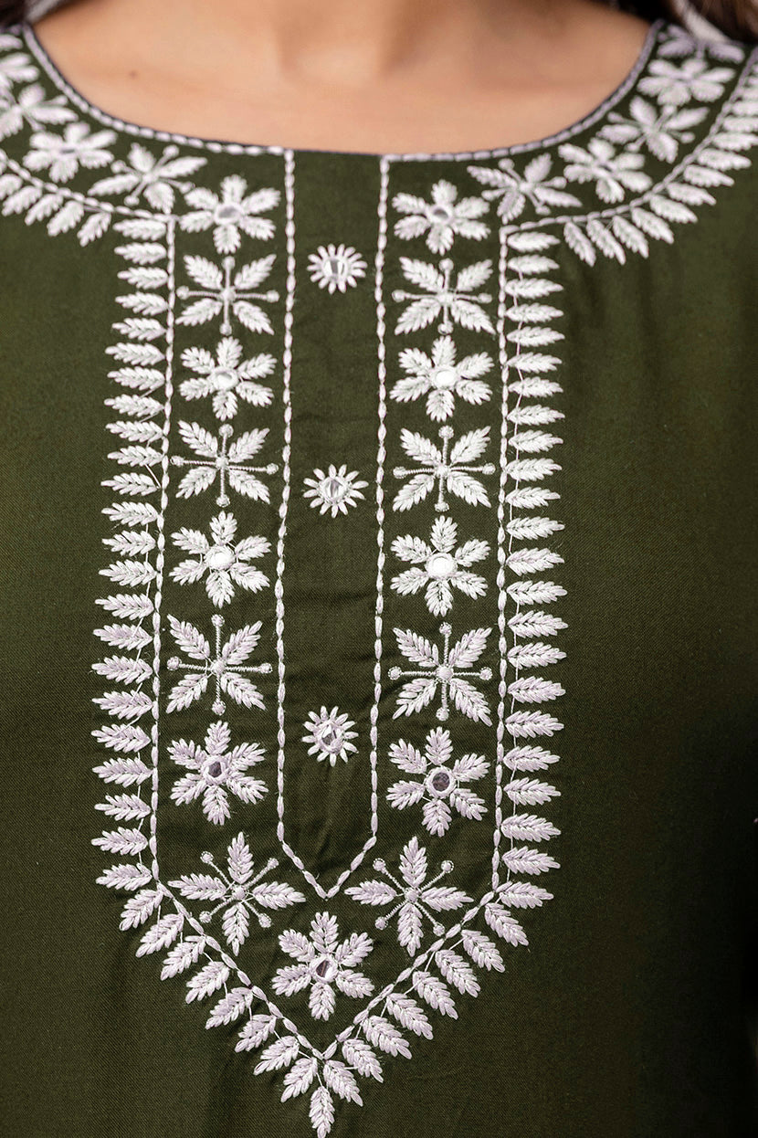 Women Dark Green & White Chawal Taka Embroidered Viscose Rayon Straight Kurti