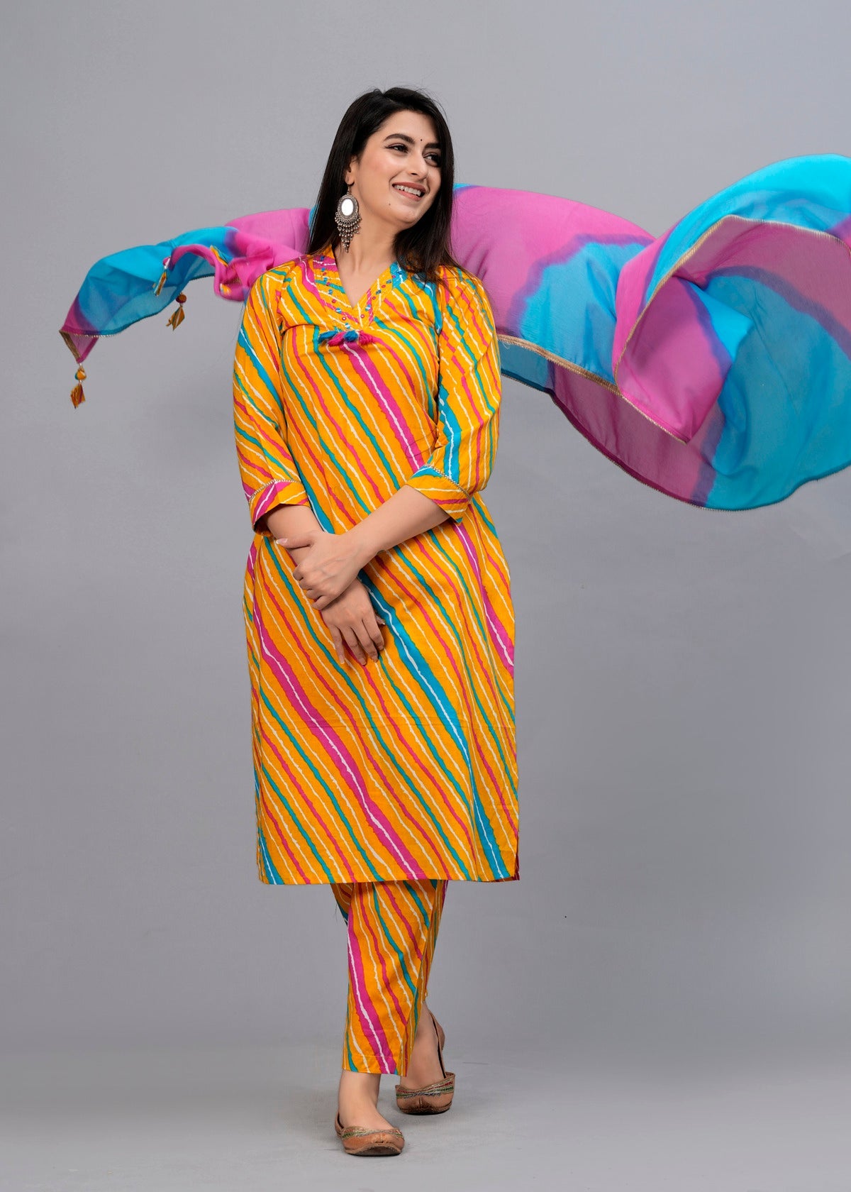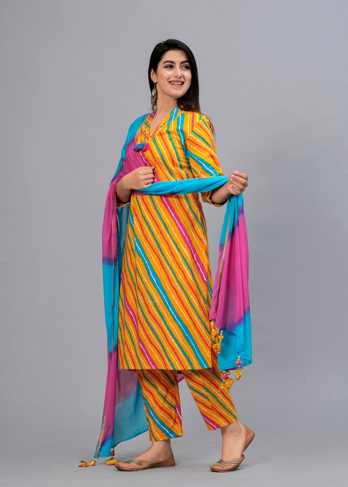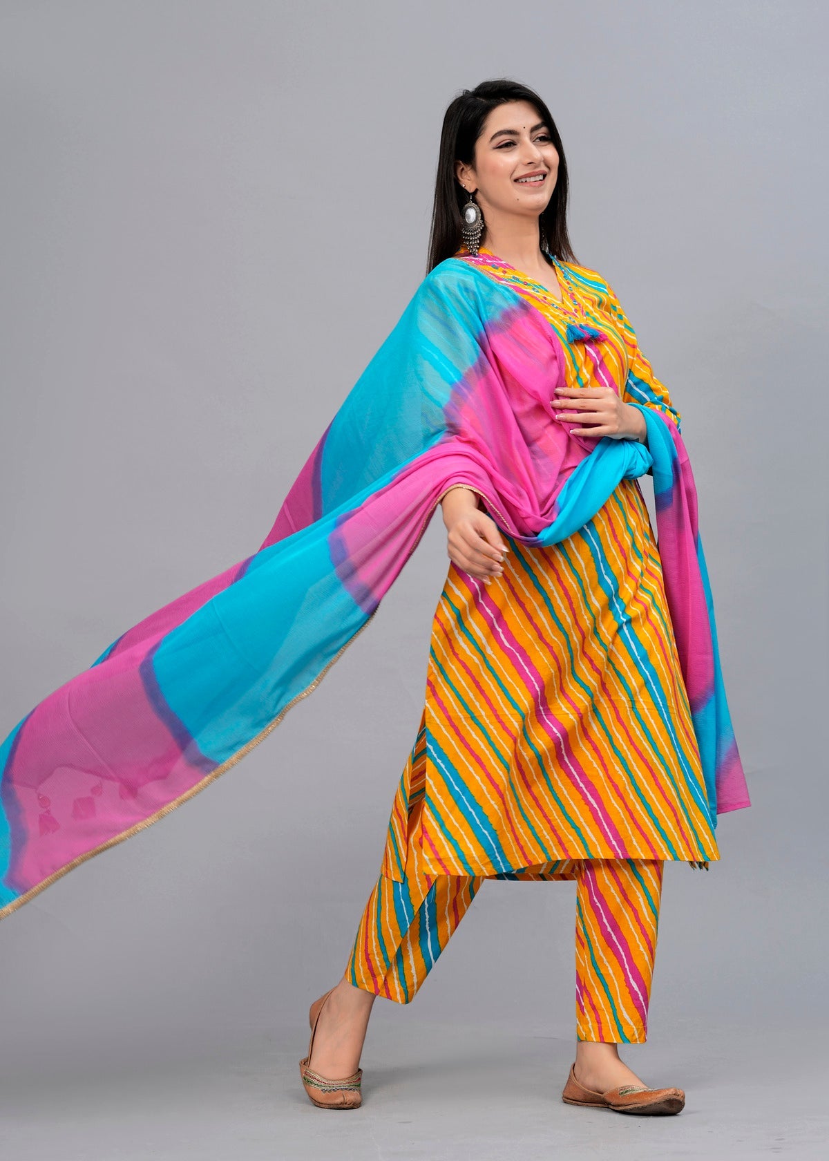Women Multicolor Leheriya Printed Kurta with Trousers & Dupatta