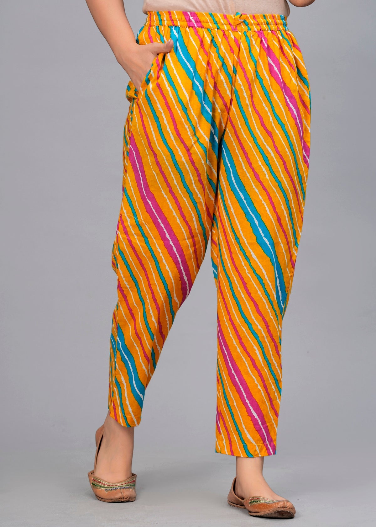 Multicolor printed trousers, has partially elasticated waistband, 1 side pocket, and slip-on closure.